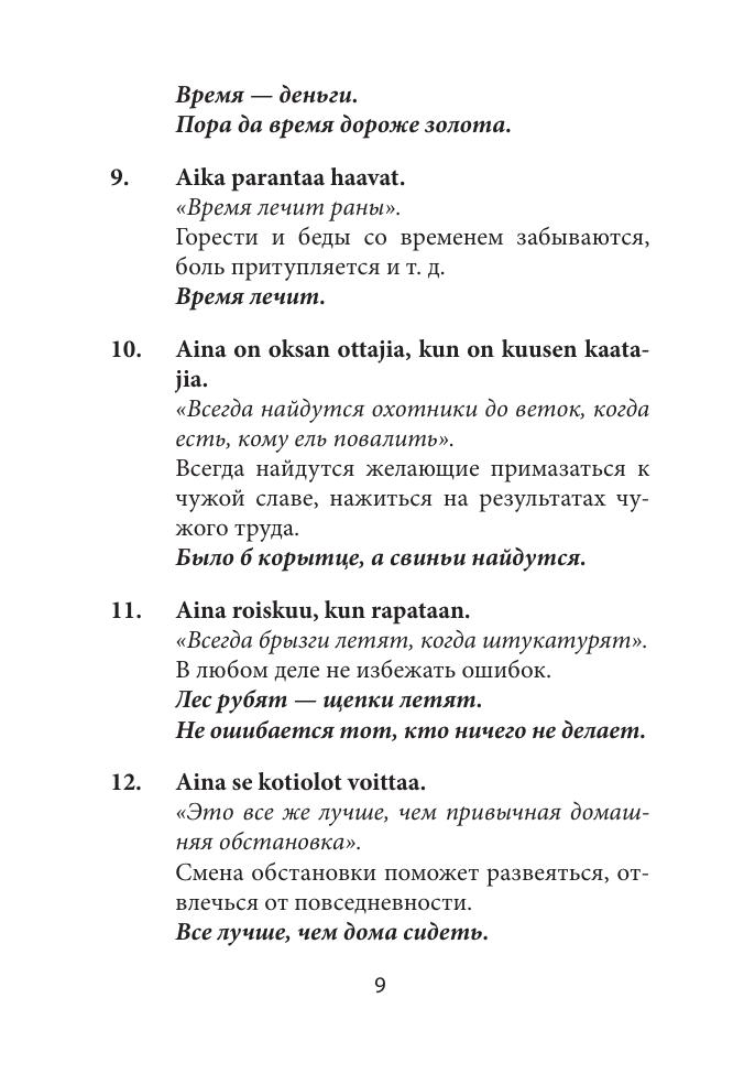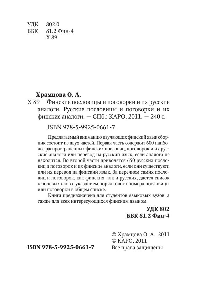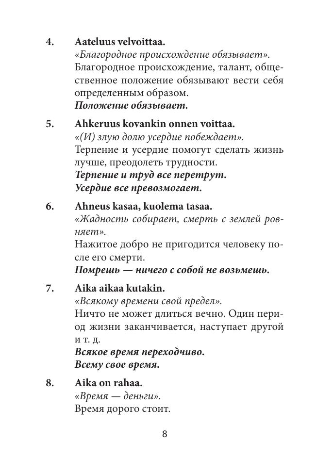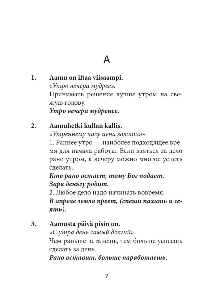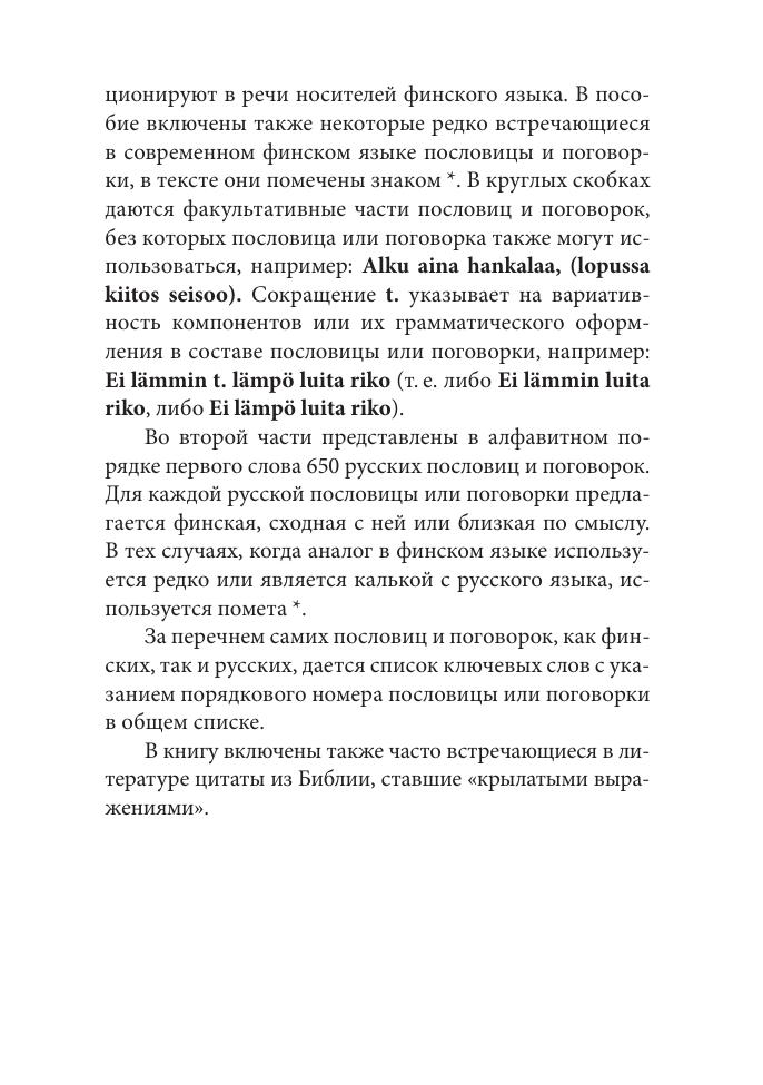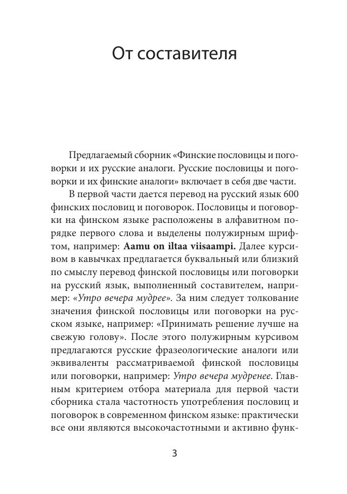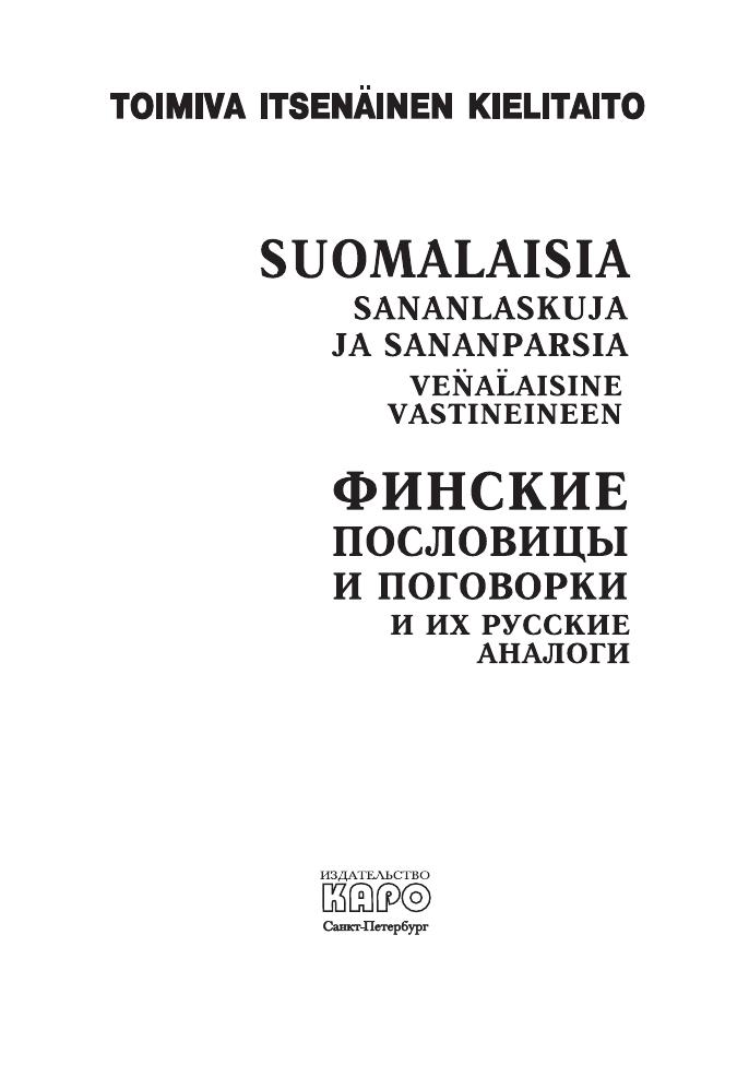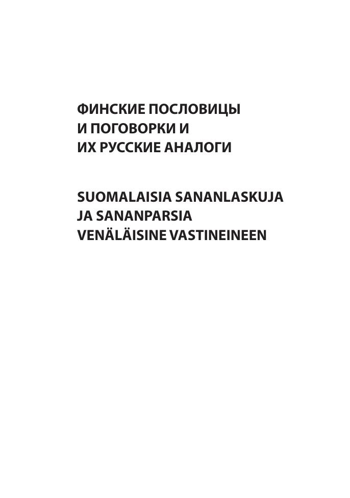 Предлагаемый вниманию изучающих финский язык сборник состоит из двух частей. Первая часть содержит 600 наиболее распространенных финских пословиц, поговорок и их русские аналоги или перевод на русский язык, если аналога не находится. Во второй части приводятся 650 русских пословиц и поговорок и их финские аналоги, если они существуют, или их перевод на финский язык. За перечнем самих пословиц и поговорок, как финских, так и русских, дается список ключевых слов с указанием порядкового номера пословицы или поговорки в общем списке.Книга предназначена для студентов языковых вузов, а также для всех интересующихся финским языком.