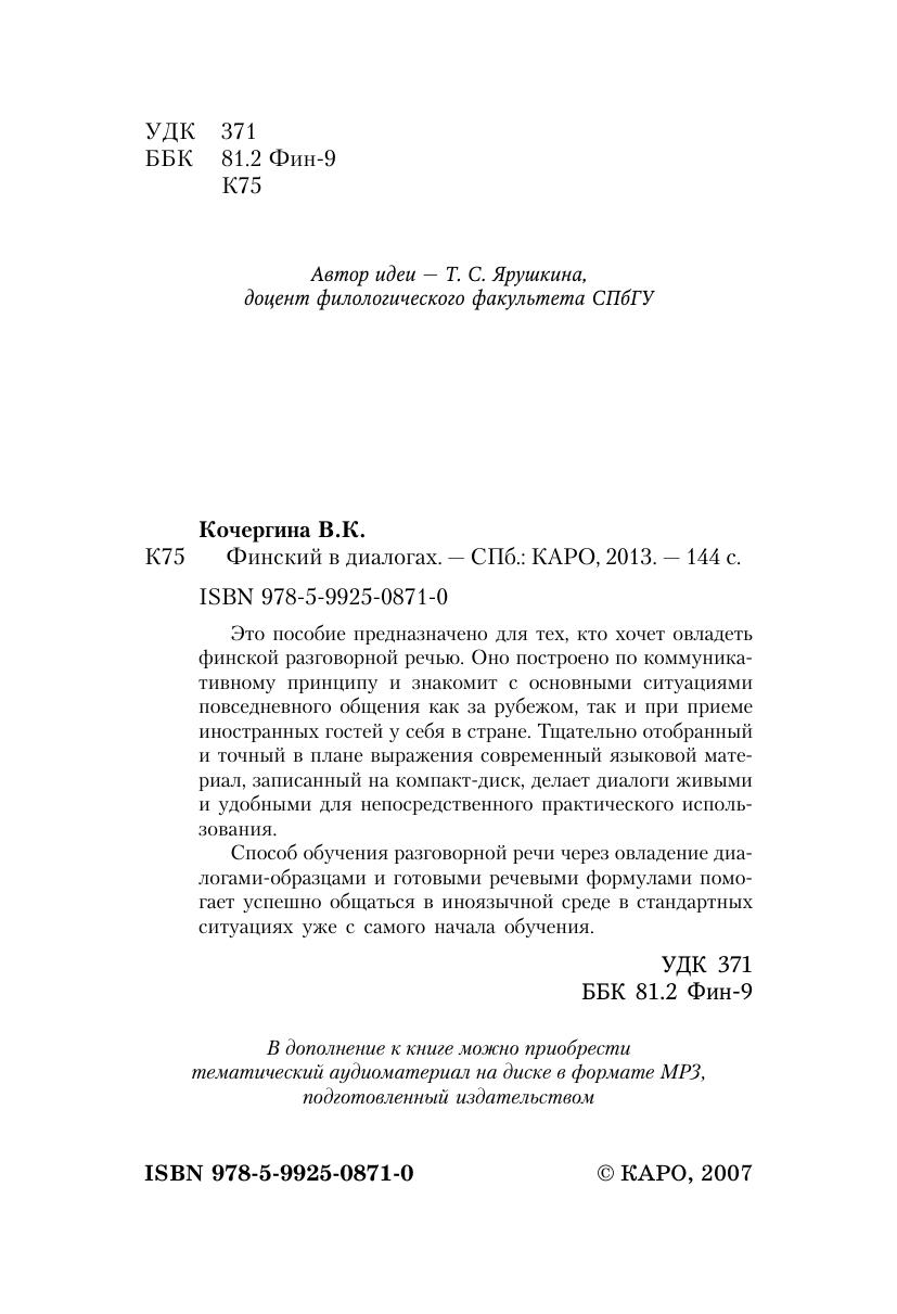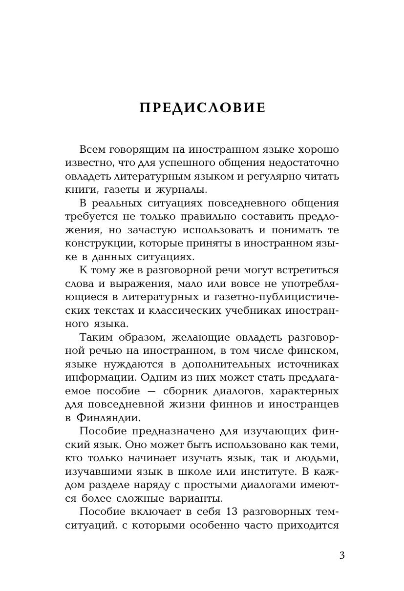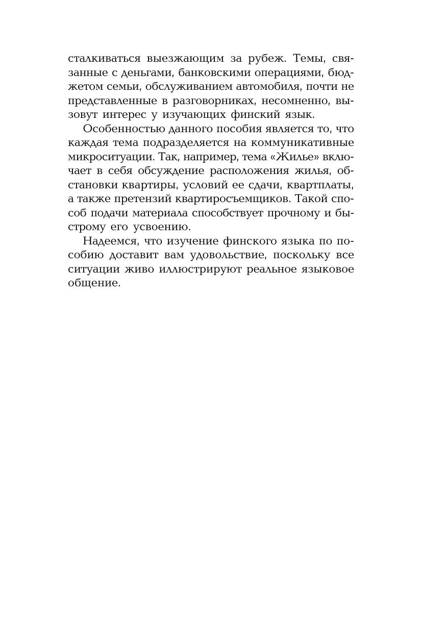 Это пособие предназначено для тех, кто хочет овладеть финской разговорной речью. Оно построено по коммуникативному принципу и знакомит с основными ситуациями повседневного общения как за рубежом, так и при приеме иностранных гостей у себя в стране. Тщательно отобранный и точный в плане выражения современный языковой материал, записанный на компакт?диск, делает диалоги живыми и удобными для непосредственного практического использования.