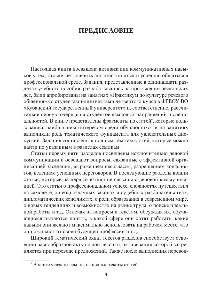 Представленный практикум направлен на интенсификацию навыков речевой коммуникации в профессиональной среде. Каждый из разделов содержит статью, посвященную актуальным проблемам деловой сферы, вопросы для её обсуждения, упражнения для перевода и закрепления новой лексики, а также другие письменные и устные задания. В ходе обсуждения интересных статей студенты учатся логично и аргументированно выражать свое мнение, соблюдая правила грамматики английского языка и используя новую лексику.