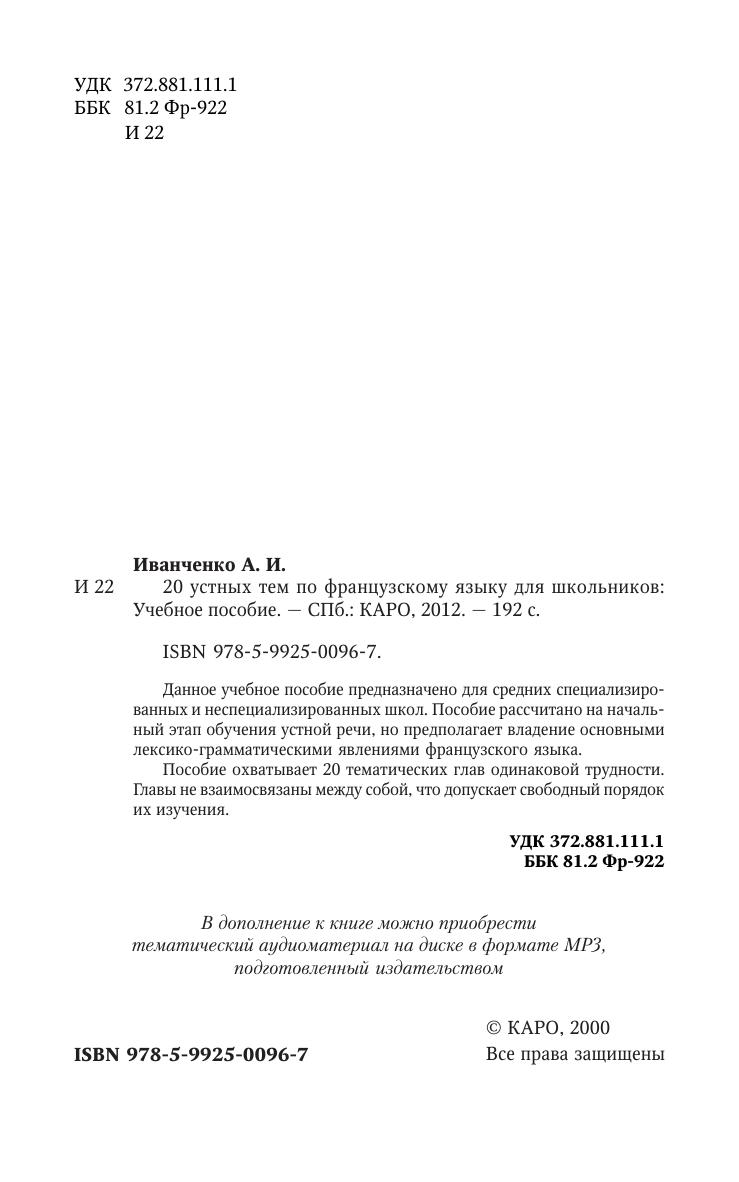 20 устных тем по французскому языку для школьников: Учебное пособие