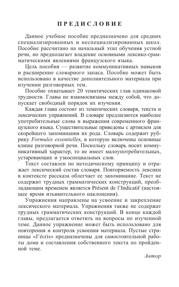 Данное учебное пособие предназначено для средних специализированных и неспециализированных школ. Пособие рассчитано на начальный этап обучения устной речи, но предполагает владение основными лексико-грамматическими явлениями французского языка. Пособие охватывает 20 тематических глав одинаковой трудности. Главы не взаимосвязаны между собой, что допускает свободный порядок их изучения.