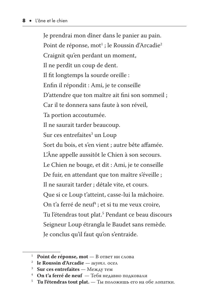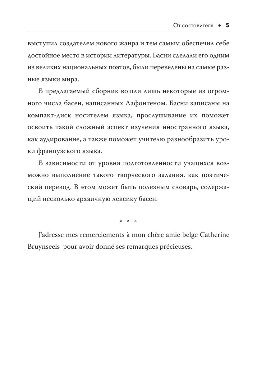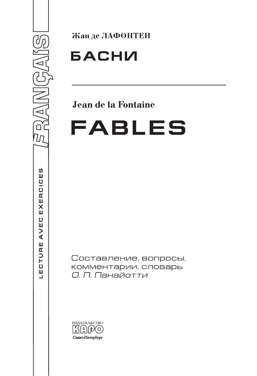 Книга представляет собой сборник басен Жана де Лафонтена с комментариями, вопросами и словарем. Книга может быть использована как на уроках французского языка в школах, так и на факультативных занятиях, а также на различных курсах иностранных языков.