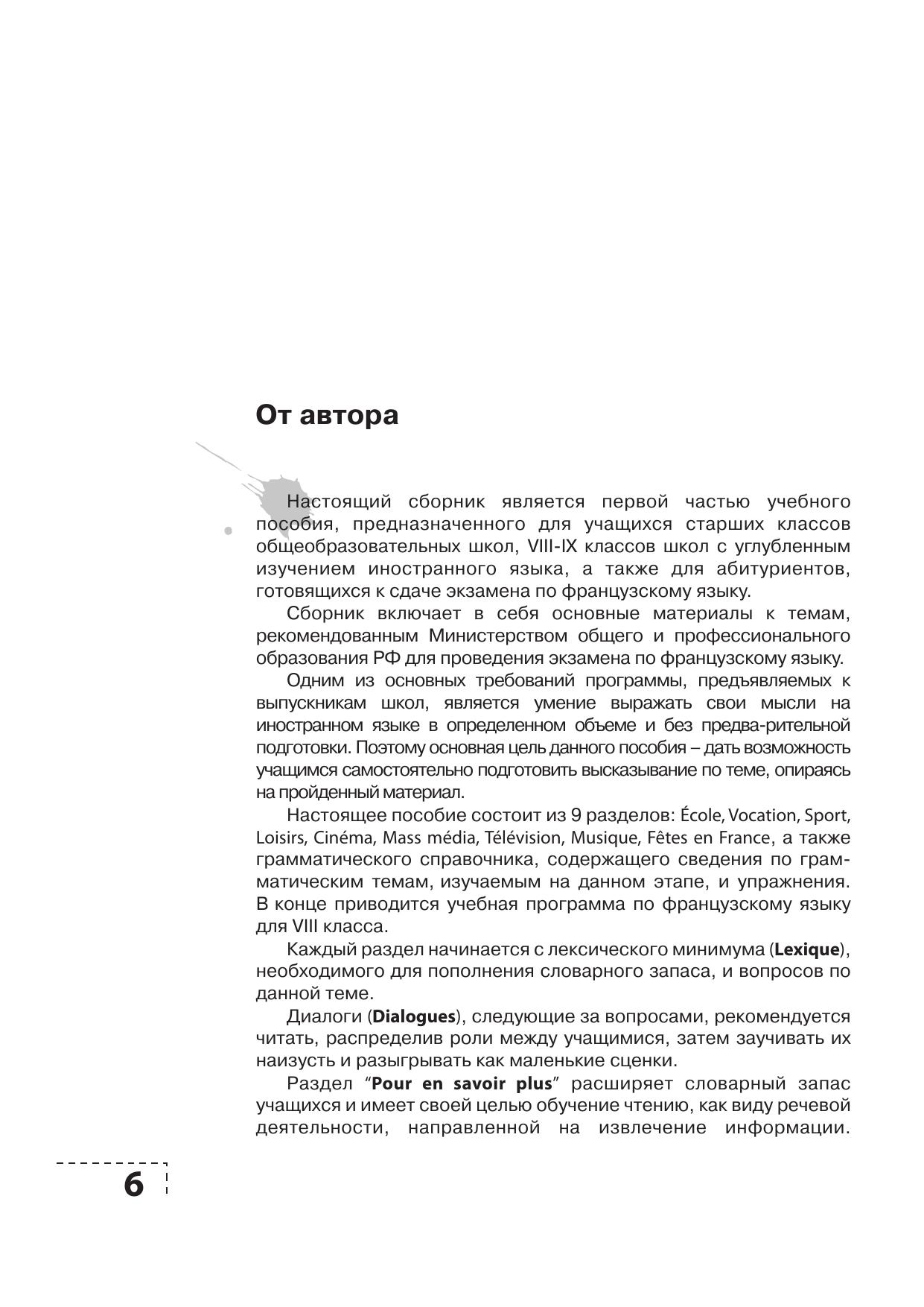 Сборник включает в себя основные материалы к темам, рекомендованным Министерством образования и науки РФ для проведения экзамена по французскому языку, а также краткий грамматический справочник с упражнениями и программу по французскому языку для VIII класса школ с углубленным изучением французского языка и гимназий.