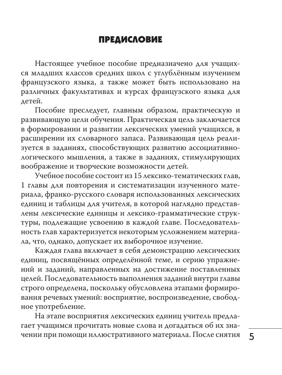 Настоящее учебное пособие предназначено для учащихся младших классов средних школ с углублённым изучением французского языка, а также может быть использовано на различных факультативах и курсах французского языка для детей.Целью пособия является не только формирование лексических умений младших школьников, но и развитие ассоциативно-логического мышления, воображения и творческих способностей детей. Усвоению лексических единиц содействуют игровые формулировки заданий, а также богатый иллюстративный материал. Пособие не содержит трудных грамматических явлений и конструкций.