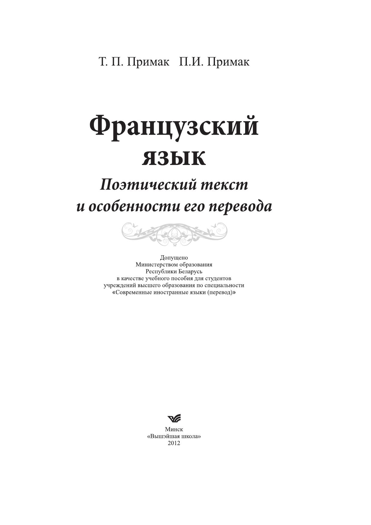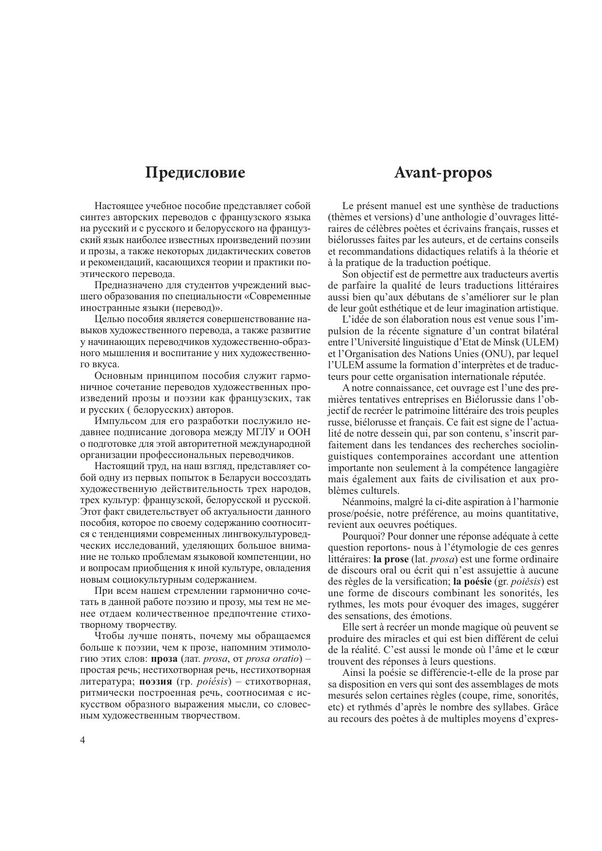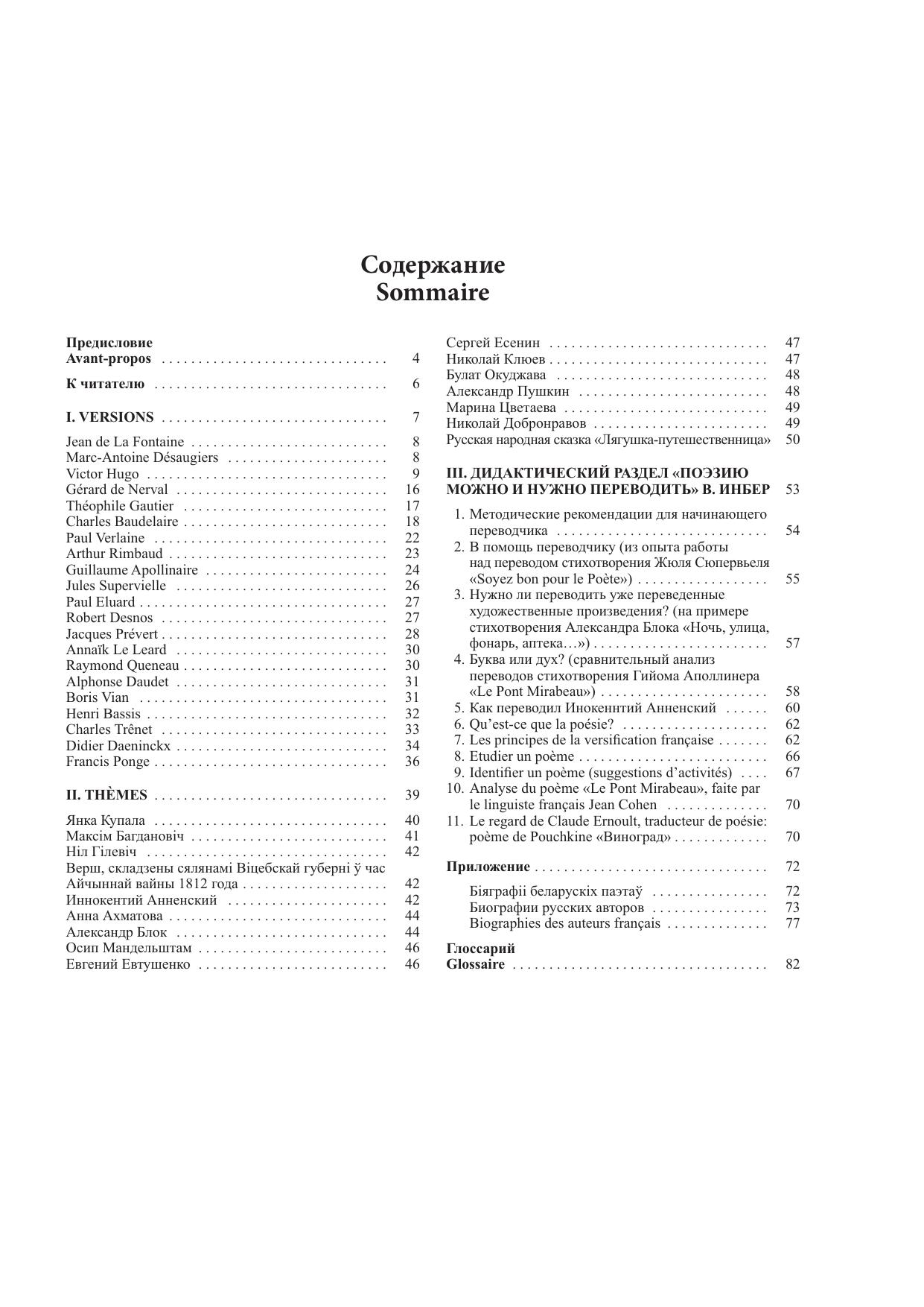 Представляет обучающий курс по мастерству литературного перевода. Состоит из переводов французской поэзии на русский язык и произведений белорусских и русских авторов на французский язык. Дидактическая часть содержит практические упражнения по сравнительному анализу переводов на основе данных стихотворений. В приложении представлены биографии авторов и глоссарий терминов по стихосложению. Для студентов учреждений высшего образования. Может быть использовано учащимися колледжей, лицеев, гимназий.