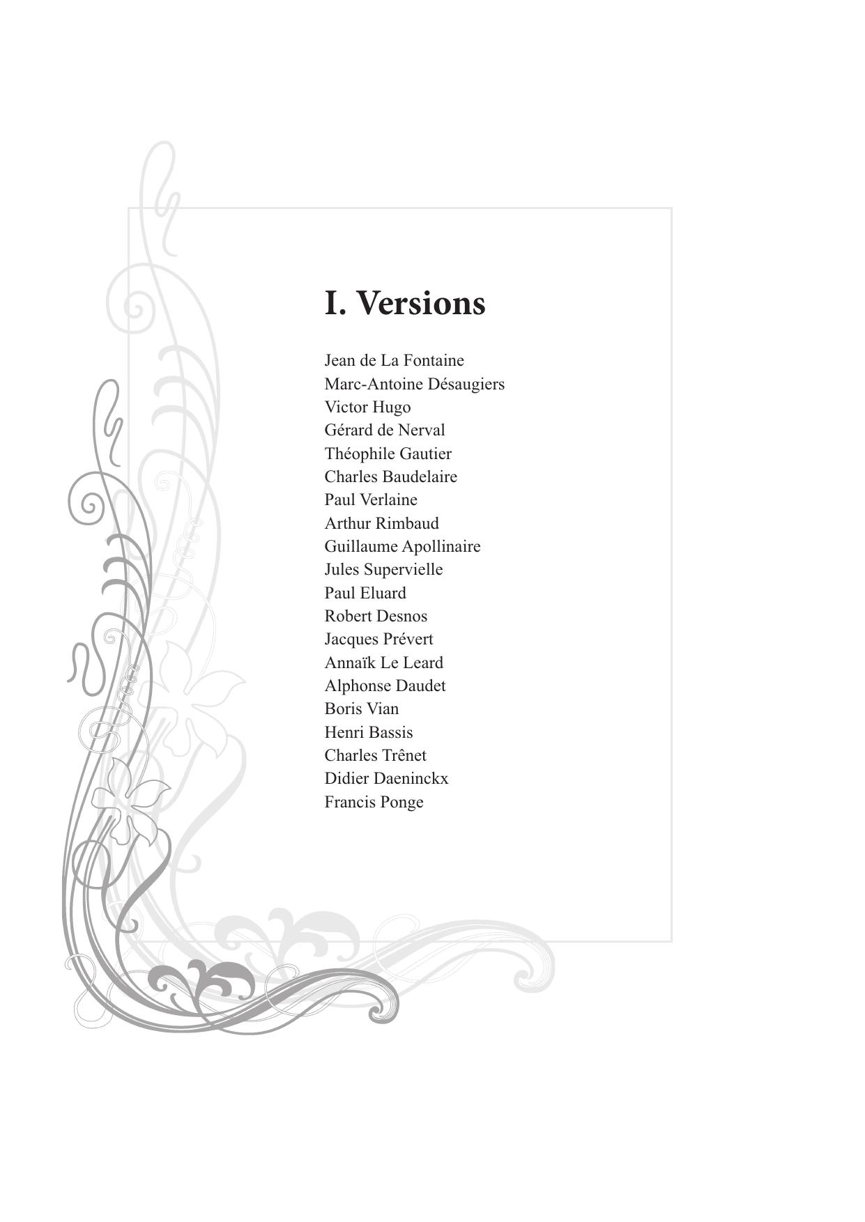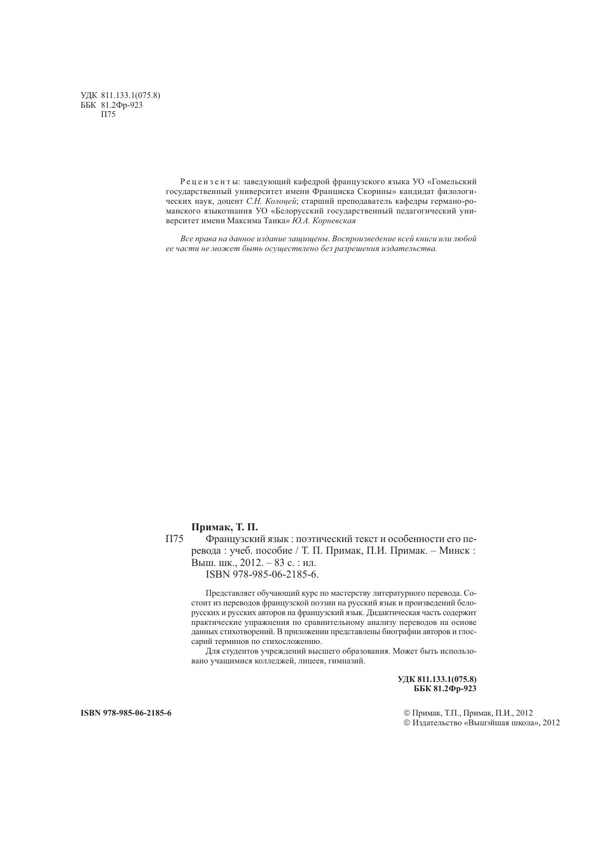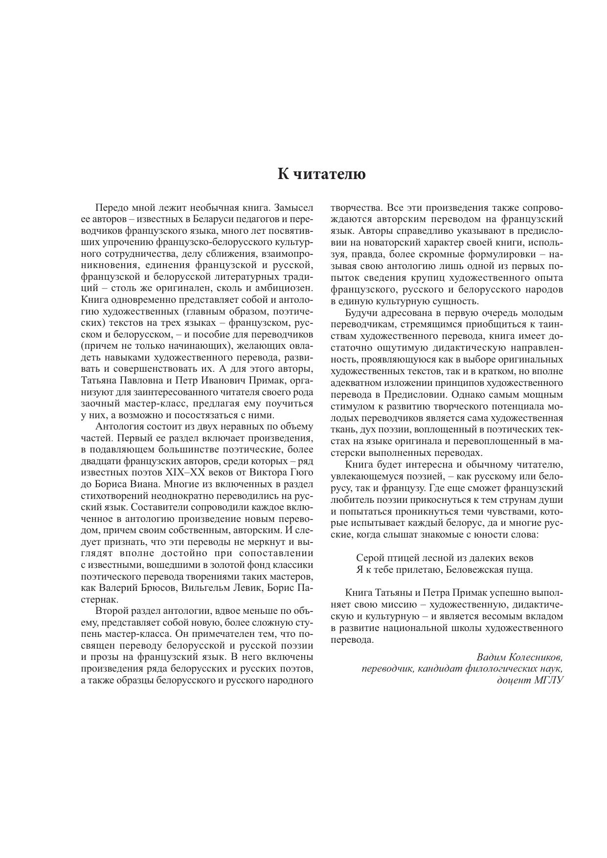 Представляет обучающий курс по мастерству литературного перевода. Состоит из переводов французской поэзии на русский язык и произведений белорусских и русских авторов на французский язык. Дидактическая часть содержит практические упражнения по сравнительному анализу переводов на основе данных стихотворений. В приложении представлены биографии авторов и глоссарий терминов по стихосложению. Для студентов учреждений высшего образования. Может быть использовано учащимися колледжей, лицеев, гимназий.