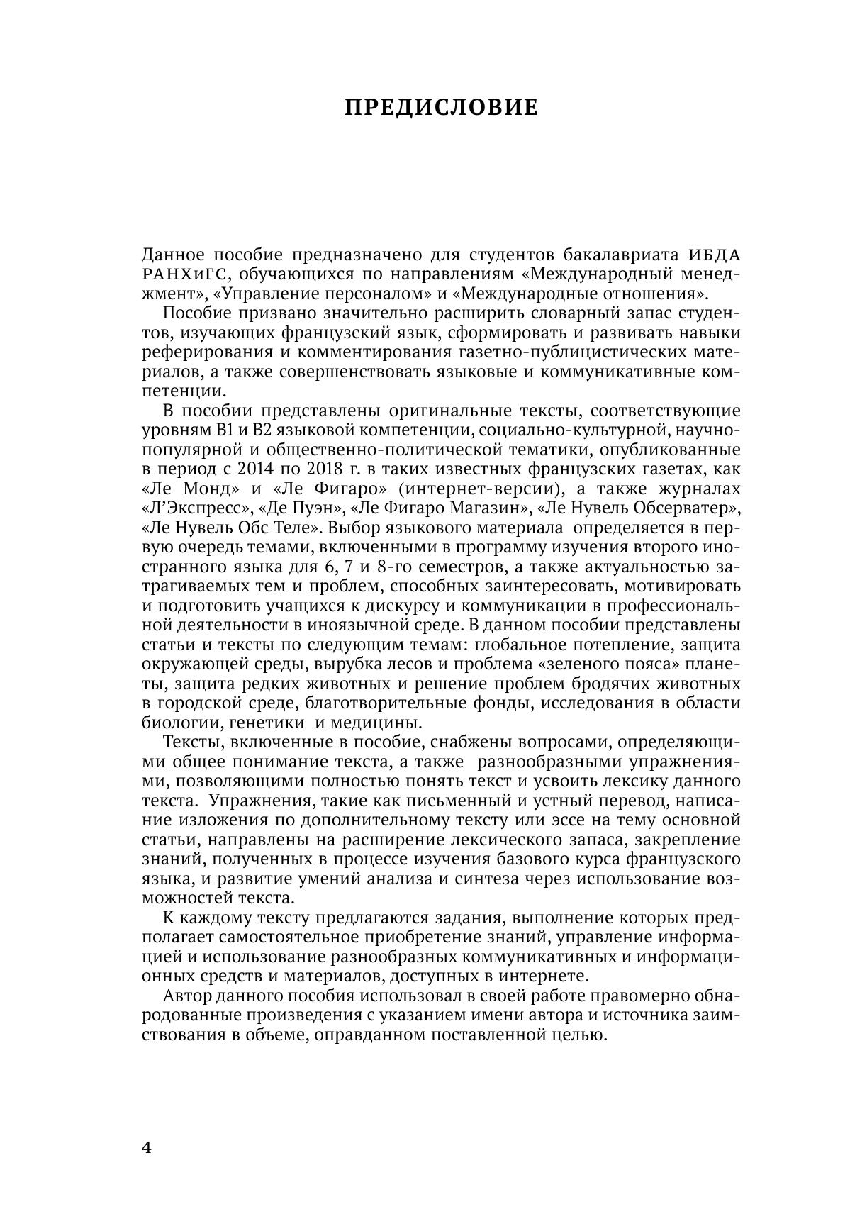 Данное пособие предназначено для студентов старших курсов бакалавриата ИБДА РАНХиГС, обучающихся по направлениям «Международный менеджмент», «Управление персоналом» и «Международные отношения». Пособие призвано значительно расширить словарный запас студентов, изучающих французский язык, сформировать и развивать навыки реферирования и комментирования газетно-публицистических материалов, а также совершенствовать языковые и коммуникативные компетенции. Выбор языкового материала определяется в первую очередь темами, включенными в программу изучения второго иностранного языка для 6, 7 и 8-го семестров, а также актуальностью затрагиваемых тем и проблем, способных заинтересовать, мотивировать и подготовить учащихся к дискурсу и коммуникации в иноязычной среде.
