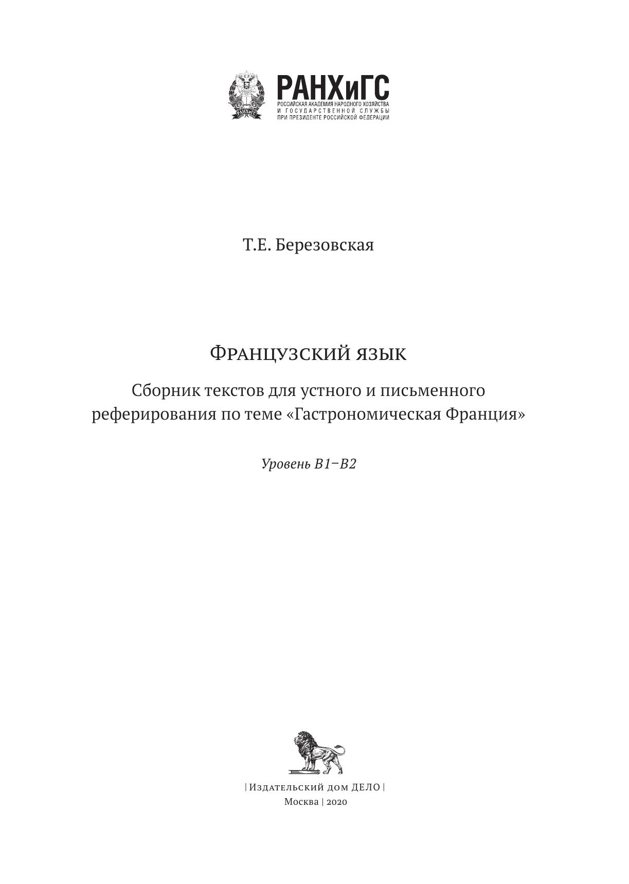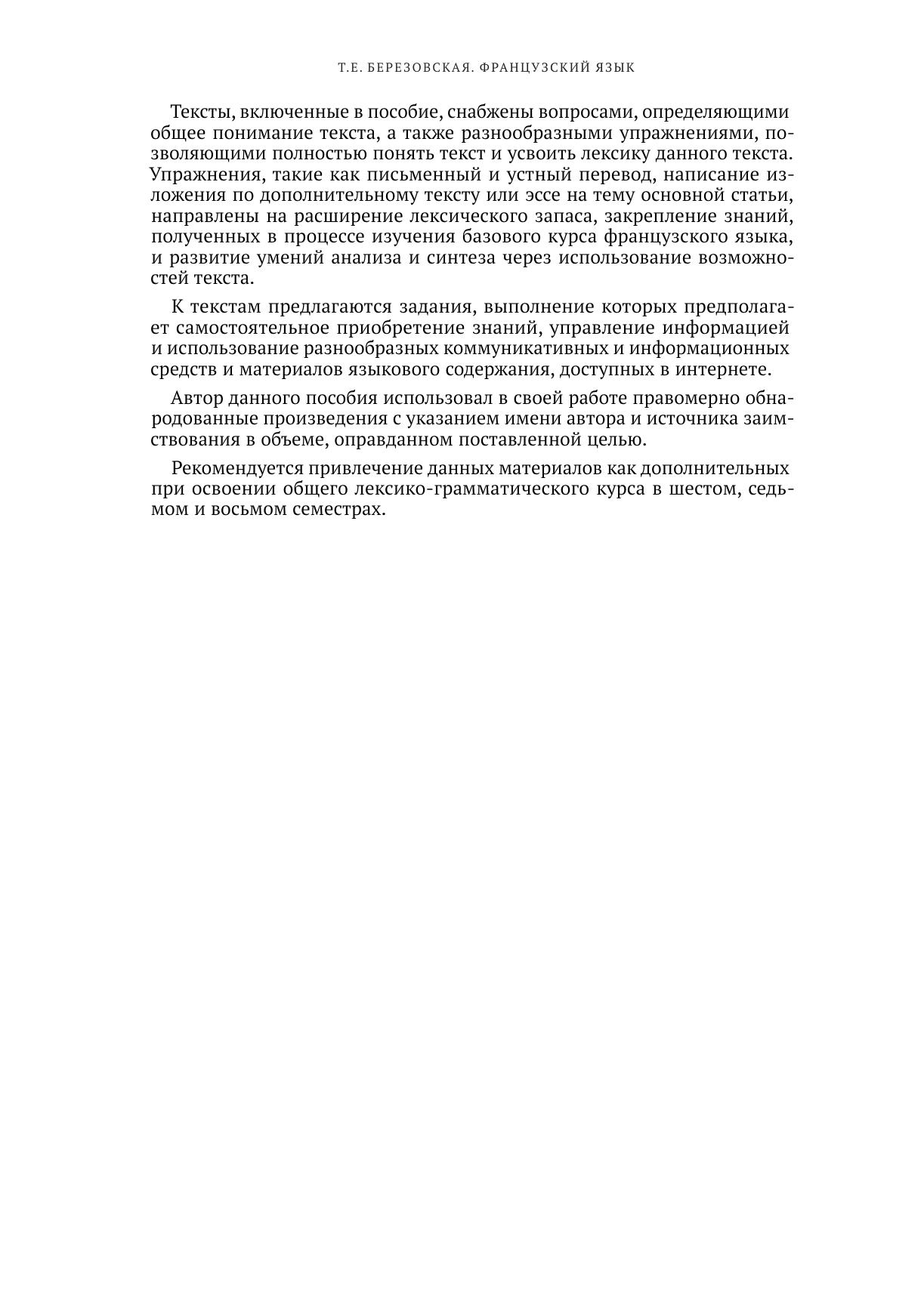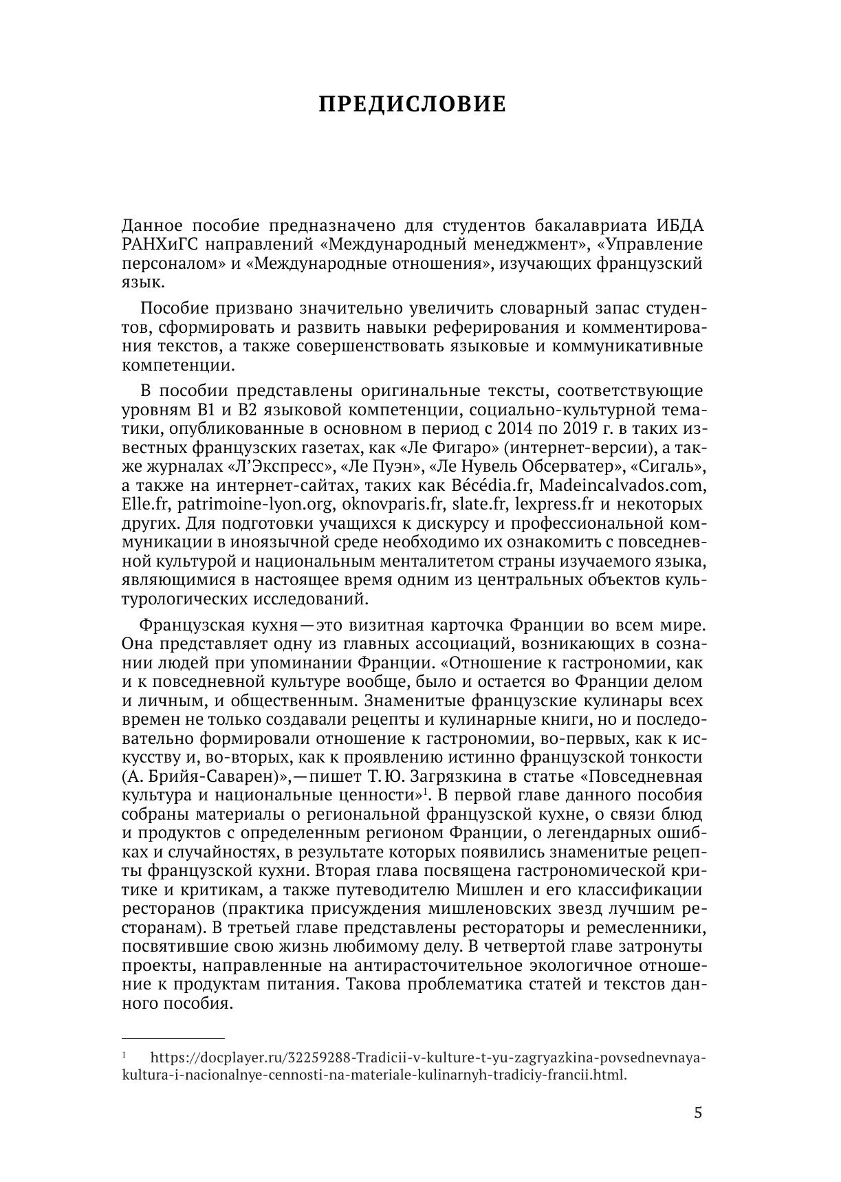 Учебное пособие предназначено для студентов бакалавриата ИБДА РАНХиГС направлений «Международный менеджмент», «Управление персоналом» и «Международные отношения», изучающих французский язык, с целью увеличения словарного запаса студентов, формирования и развития навыков реферирования и комментирования текстов, а также совершенствования языковых и коммуникативных компетенций. В пособии представлены оригинальные тексты социально-культурной тематики, соответствующие уровням языковой компетенции В1 и В2, опубликованные в основном в 2014–2019 годах в известных французских газетах, таких как «Ле Фигаро» (интернет-версии), а также журналах «Л’Экспресс», «Ле Пуэн», «Ле Нувель Обсерватер», «Сигаль» и на интернет-сайтах. К текстам даны задания, выполнение которых предполагает самостоятельное приобретение знаний, управление информацией и использование разнообразных коммуникативных и информационных средств и материалов языкового содержания, доступных в интернете.