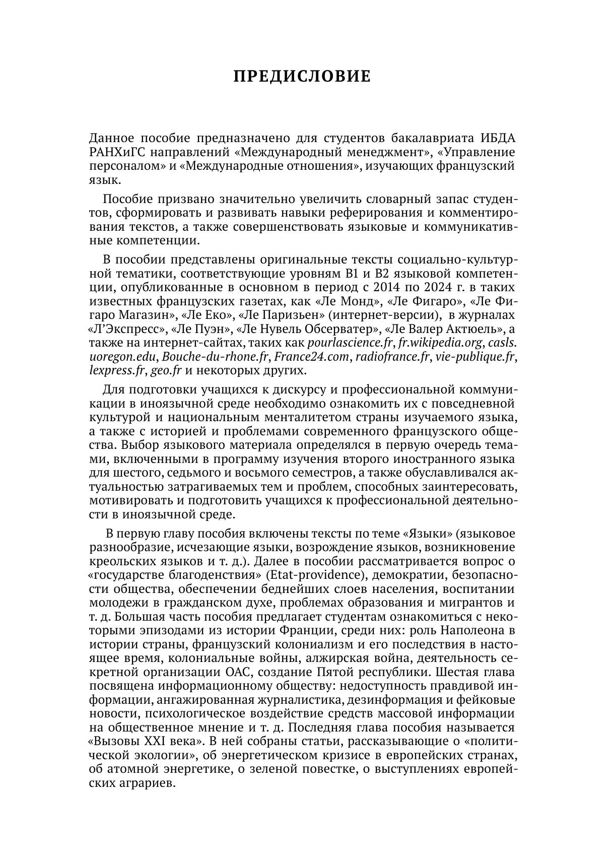 Настоящее учебное пособие по французскому языку предназначено для студентов 4-го курса бакалавриата ИБДА РАНХиГС, обучающихся по направлениям «Международный менеджмент», «Управление персоналом» и «Международные отношения». В пособии представлены оригинальные тексты социально-культурной тематики, соответствующие уровням В1 и В2 языковой компетенции, опубликованные в основном в период с 2014 по 2024 г. в известных французских газетах. Для подготовки учащихся к дискурсу и профессиональной коммуникации в иноязычной среде необходимо ознакомить их с повседневной культурой и национальным менталитетом страны изучаемого языка, а также с историей и проблемами современного французского общества. Рекомендуется привлечение данных материалов как дополнительных при освоении общего лексико-грамматического курса в шестом, седьмом и восьмом семестрах.