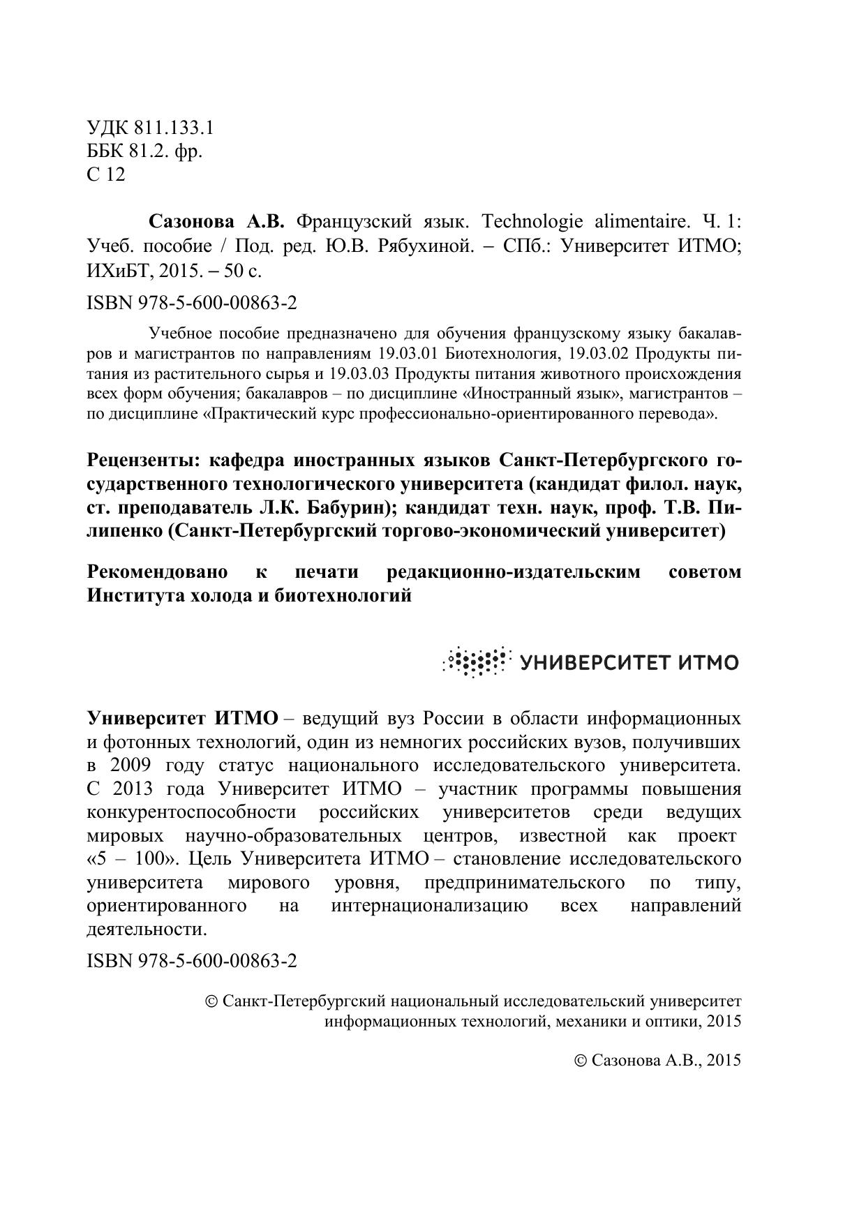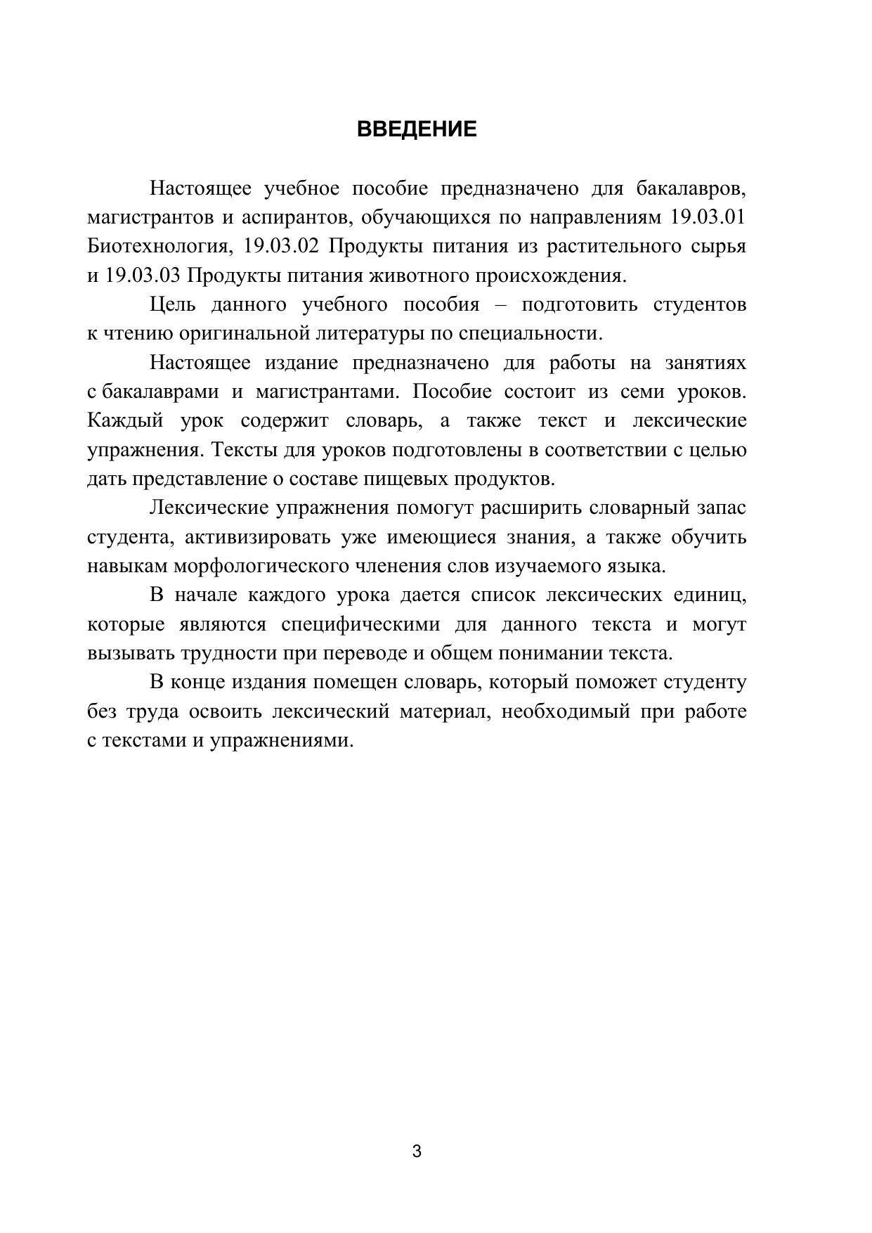 Учебное пособие предназначено для обучения французскому языку бакалавров и магистрантов по направлениям 19.03.01 Биотехнология, 19.03.02 Продукты питания из растительного сырья и 19.03.03 Продукты питания животного происхождения всех форм обучения бакалавров – по дисциплине «Иностранный язык», магистрантов – по дисциплине «Практический курс профессионально-ориентированного перевода».