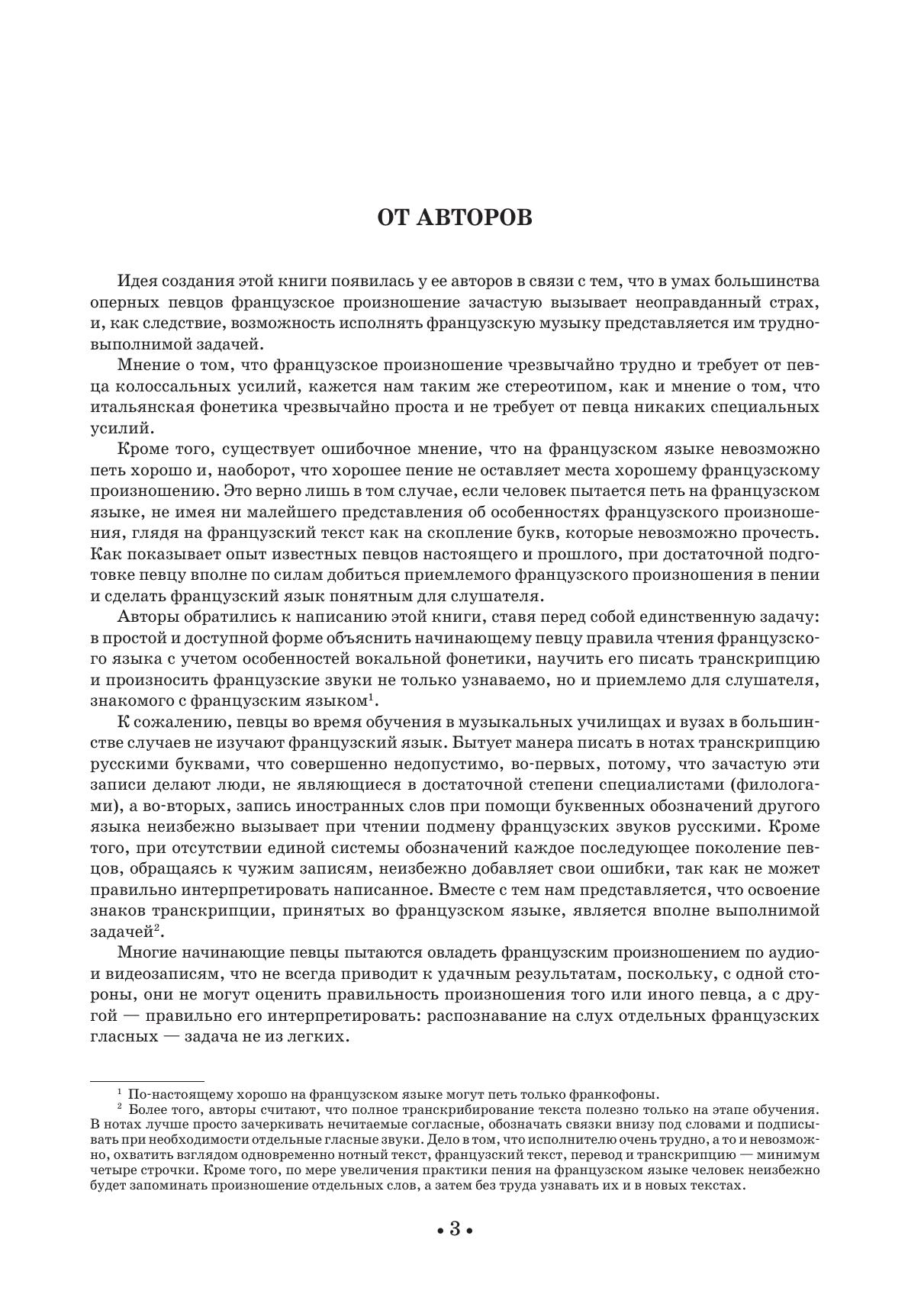Материал, изложенный в книге, будет интересен и полезен преподавателям французского языка, в частности тем, кто работает с вокалистами, студентам-вокалистам, профессиональным певцам, преподавателям вокала, концертмейстерам, дирижерам, режиссерам и всем любителям оперы. Книга может быть полезна как людям, владеющим основами французского произношения, так и приступающим к исполнению на французском языке впервые. Может быть использована как самоучитель. К книге прилагается видео мастер-класса, на котором автор работает со студентами над произношением французского языка в вокальных произведениях.