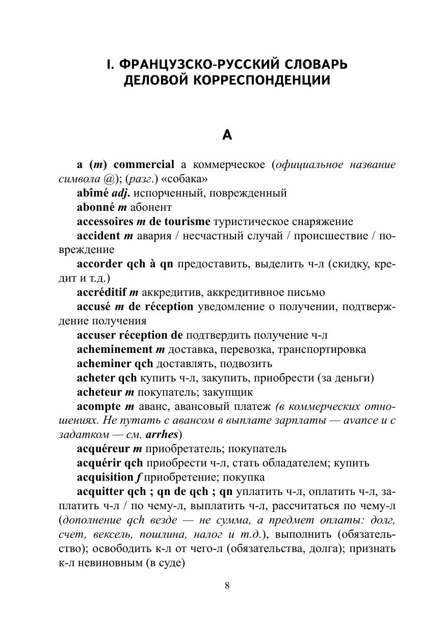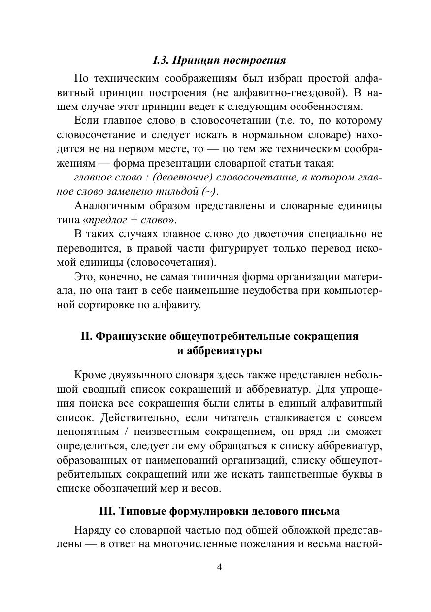 Словарь содержит более 1500 статей — это необходимый минимум по официально-деловой корреспонденции. В книге также представлен небольшой сводный список сокращений и аббревиатур. Наряду со словарной частью под общей обложкой представлены общеупотребительные обороты, принятые в корреспонденции не только на французском, но и на русском языке, они сведены в таблицы в зависимости от их содержания и цели коммуникации.