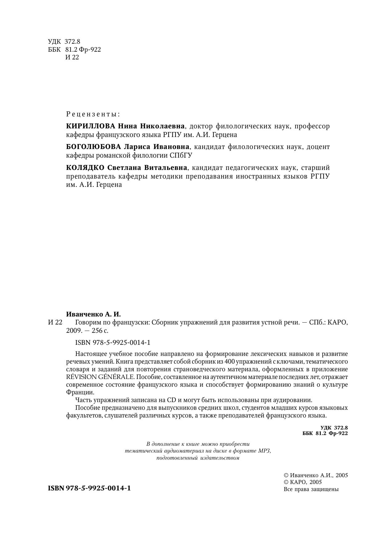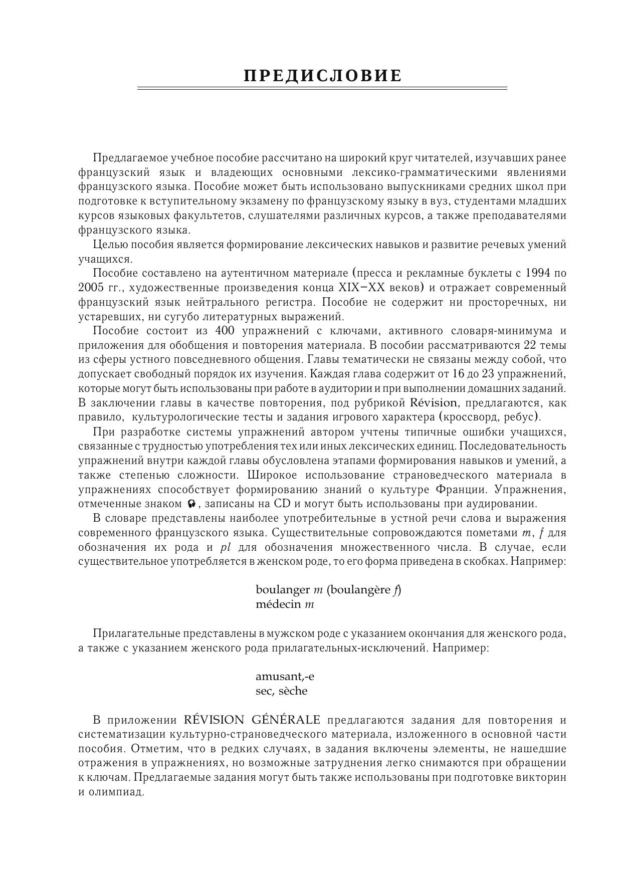 Настоящее учебное пособие направлено на формирование лексических навыков и развитие речевых умений. Книга представляет собой сборник из 400 упражнений с ключами, тематического словаря и заданий для повторения страноведческого материала, оформленных в приложение REVISION GENERALE. Пособие, составленное на аутентичном материале последних лет, отражает современное состояние французского языка и способствует формированию знаний о культуре Франции.Часть упражнений записана на CD и могут быть использованы при аудировании. Пособие предназначено для выпускников средних школ, студентов младших курсов языковых факультетов, слушателей различных курсов, а также преподавателей французского языка.