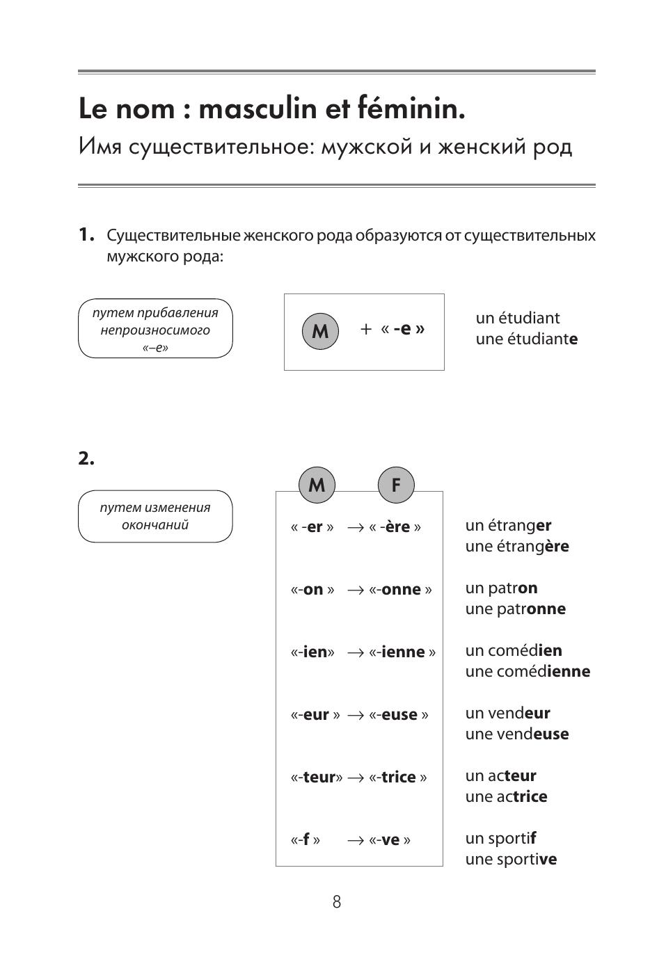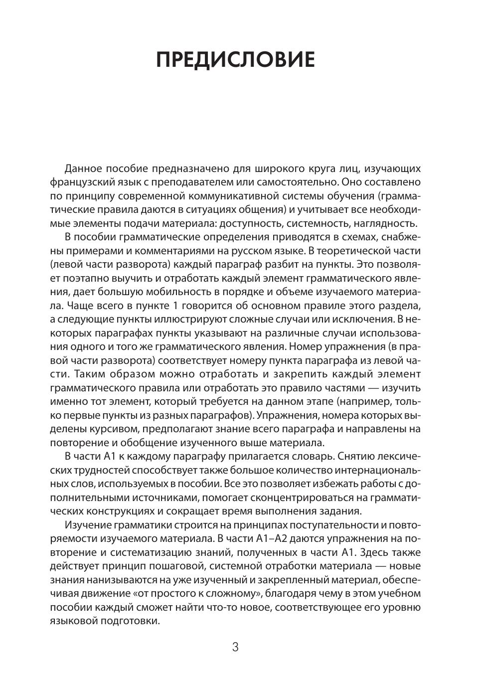 Данное учебное пособие позволяет в простой и доступной форме овладеть начальными знаниями грамматики французского языка. Пособие строится на принципах наглядности, поступательности и повторяемости изучаемого материала. Грамматические определения даны в схемах, снабжены примерами и комментариями на русском языке. Практическая часть содержит упражнения, направленные на поэтапную отработку и закрепление каждого грамматического явления: номер параграфа в теоретической части совпадает с номером упражнения. Упражнения, номера которых выделены курсивом, предполагают повторение и обобщение пройденного материала. Пособие совместимо со всеми французскими учебно-методическими комплексами.