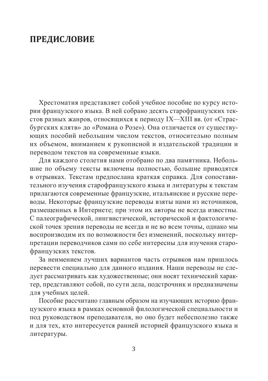 В пособии представлены старофранцузские тексты разных жанров, относящиеся к периоду IX—XIII вв. Текстам предпослана краткая справка. Для сравнения даются современные переводы.