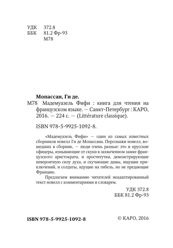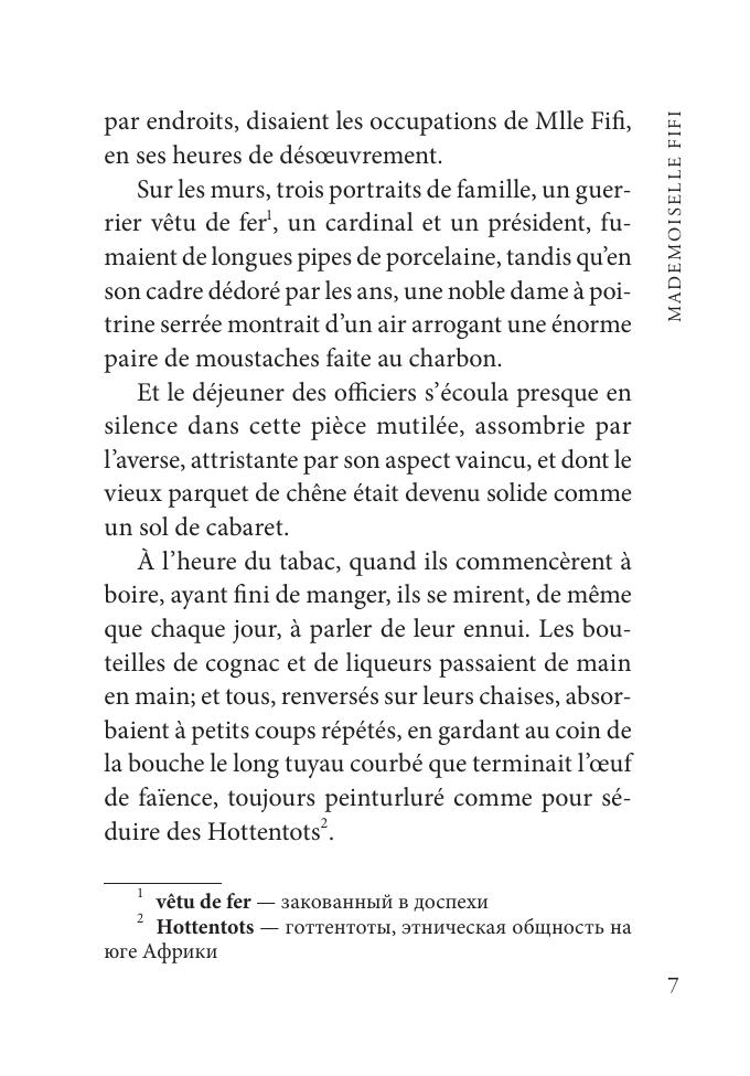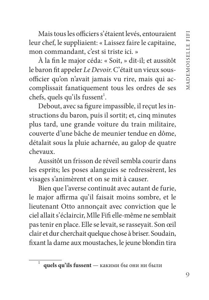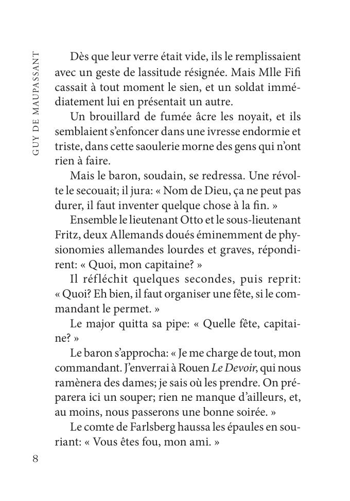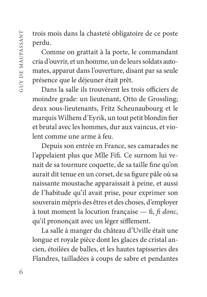 «Мадемуазель Фифи» — один из самых известных сборников новелл Ги де Мопассана. Персонажи новелл, вошедших в сборник, — люди очень разные: это и прусские офицеры, изнывающие от скуки в захваченном замке французского аристократа, и проститутки, демонстрирующие невероятную силу духа, и скучающие дамы, ищущие приключений, и солдаты, идущие на гибель, но не предающие Францию.