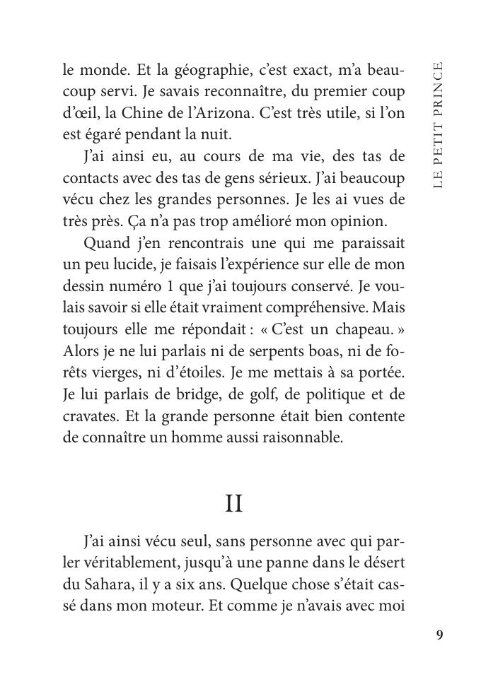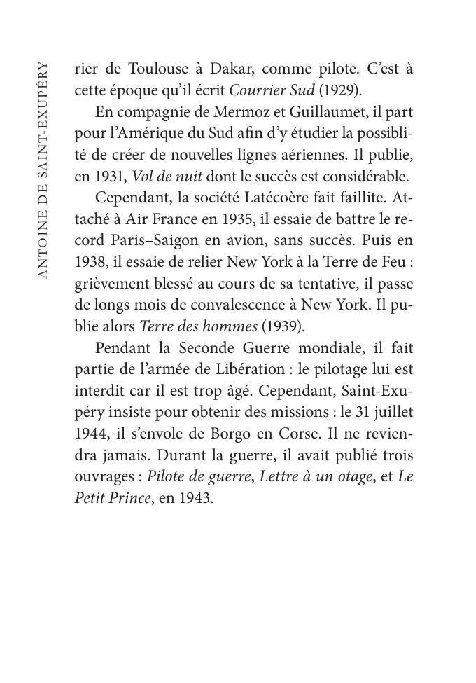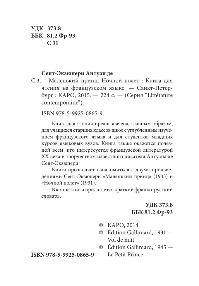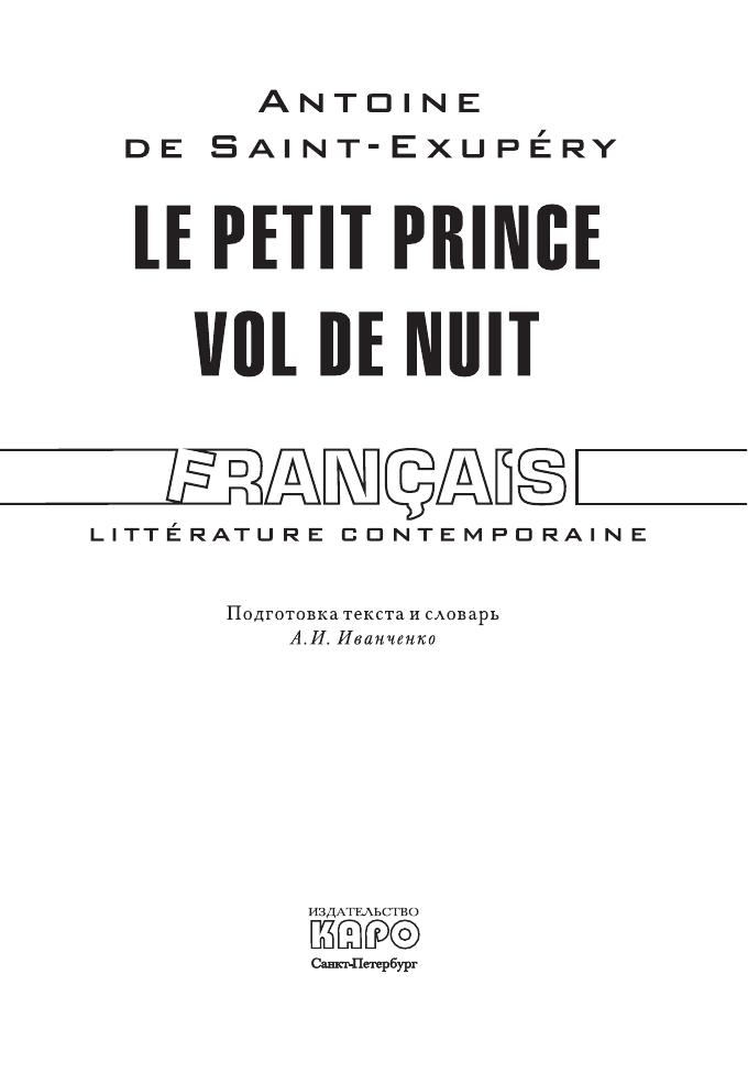 Книга прозволяет ознакомиться с двумя произведениями Сент-Экзюпери «Маленький принц» (1943) и «Ночной полет» (1931). В конце книги прилагается краткий франко-русский словарь.