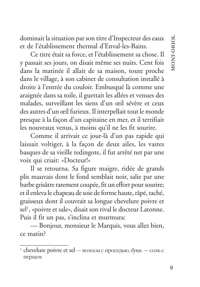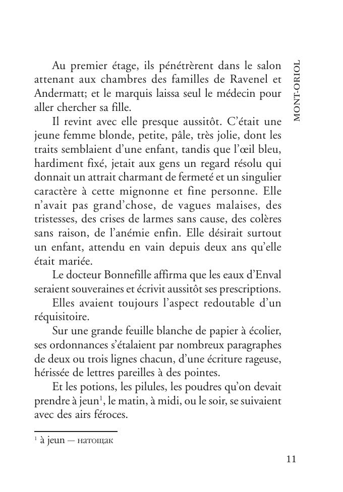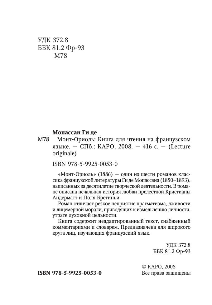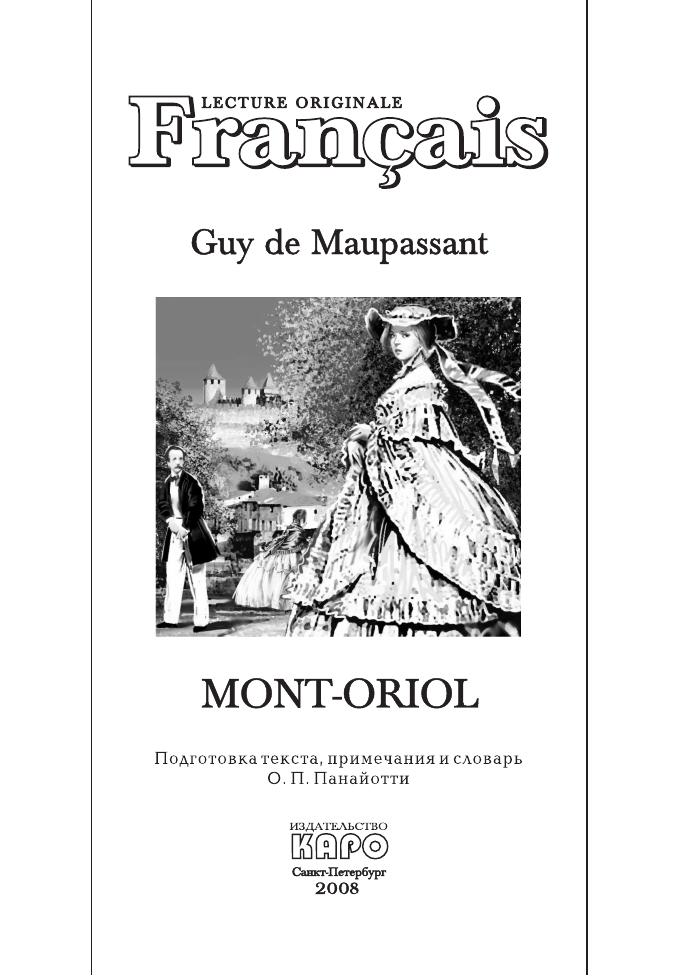«Монт-Ориоль» (1886) — один из шести романов классика французской литературы Ги де Мопассана (1850–1893), написанных за десятилетие творческой деятельности. В романе описана печальная история любви прелестной Кристианы Андерматт и Поля Бретиньи. Роман отличает резкое неприятие прагматизма, лживости и лицемерной морали, приводящих к измельчению личности, утрате духовной цельности. Книга содержит неадаптированный текст, снабженный комментариями и словарем. Предназначена для широкого круга лиц, изучающих французский язык.