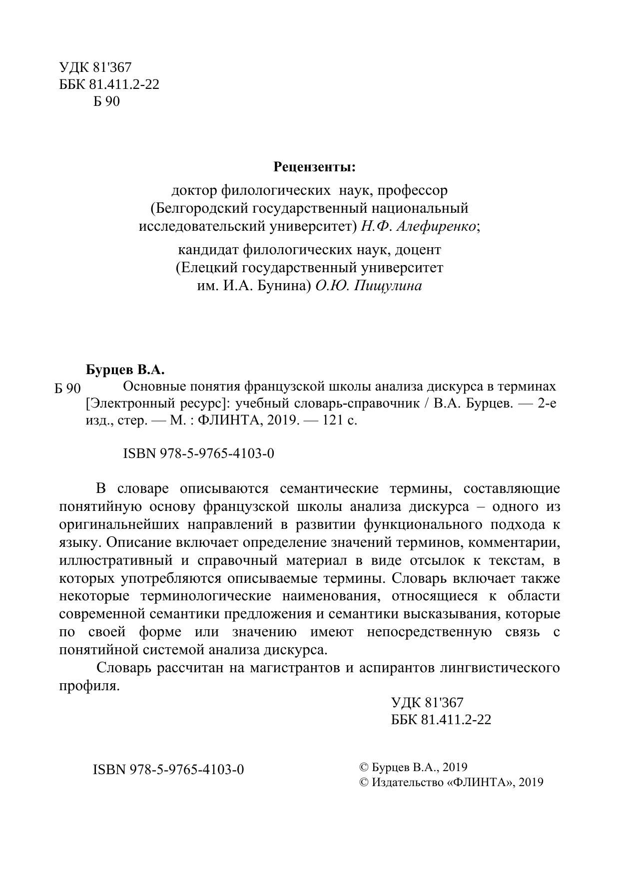 В словаре описываются семантические термины, составляющие понятийную основу французской школы анализа дискурса – одного из оригинальнейших направлений в развитии функционального подхода к языку. Описание включает определение значений терминов, комментарии, иллюстративный и справочный материал в виде отсылок к текстам, в которых употребляются описываемые термины. Словарь включает также некоторые терминологические наименования, относящиеся к области современной семантики предложения и семантики высказывания, которые по своей форме или значению имеют непосредственную связь с понятийной системой анализа дискурса.