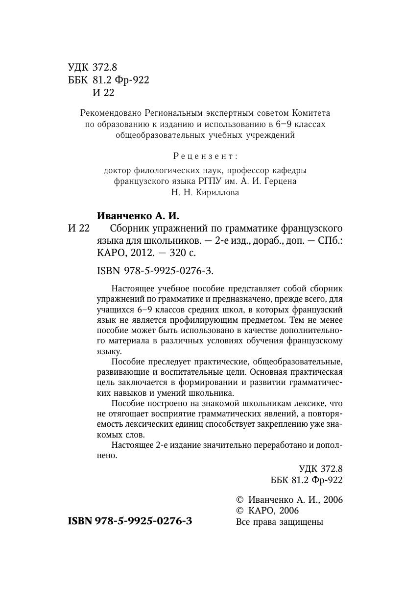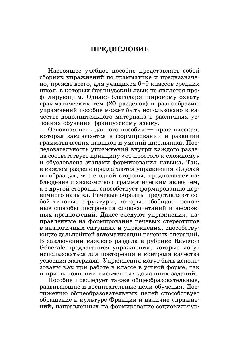 Настоящее учебное пособие представляет собой сборник упражнений по грамматике и предназначено, прежде всего, для учащихся 6-9 классов средних школ, в которых французский язык не является профилирующим. Тем не менее пособие может быть использовано в качестве дополнительного материала в различных условиях обучения французскому языку. Пособие преследует практические, общеобразовательные, развивающие и воспитательные цели. Основная практическая цель заключается в формировании и развитии грамматических навыков и умений школьника. Пособие построено на знакомой школьникам лексике, что не отягощает восприятие грамматических явлений, а повторяемость лексических единиц способствует закреплению уже знакомых слов. Настоящее 2-е издание значительно переработано и дополнено.