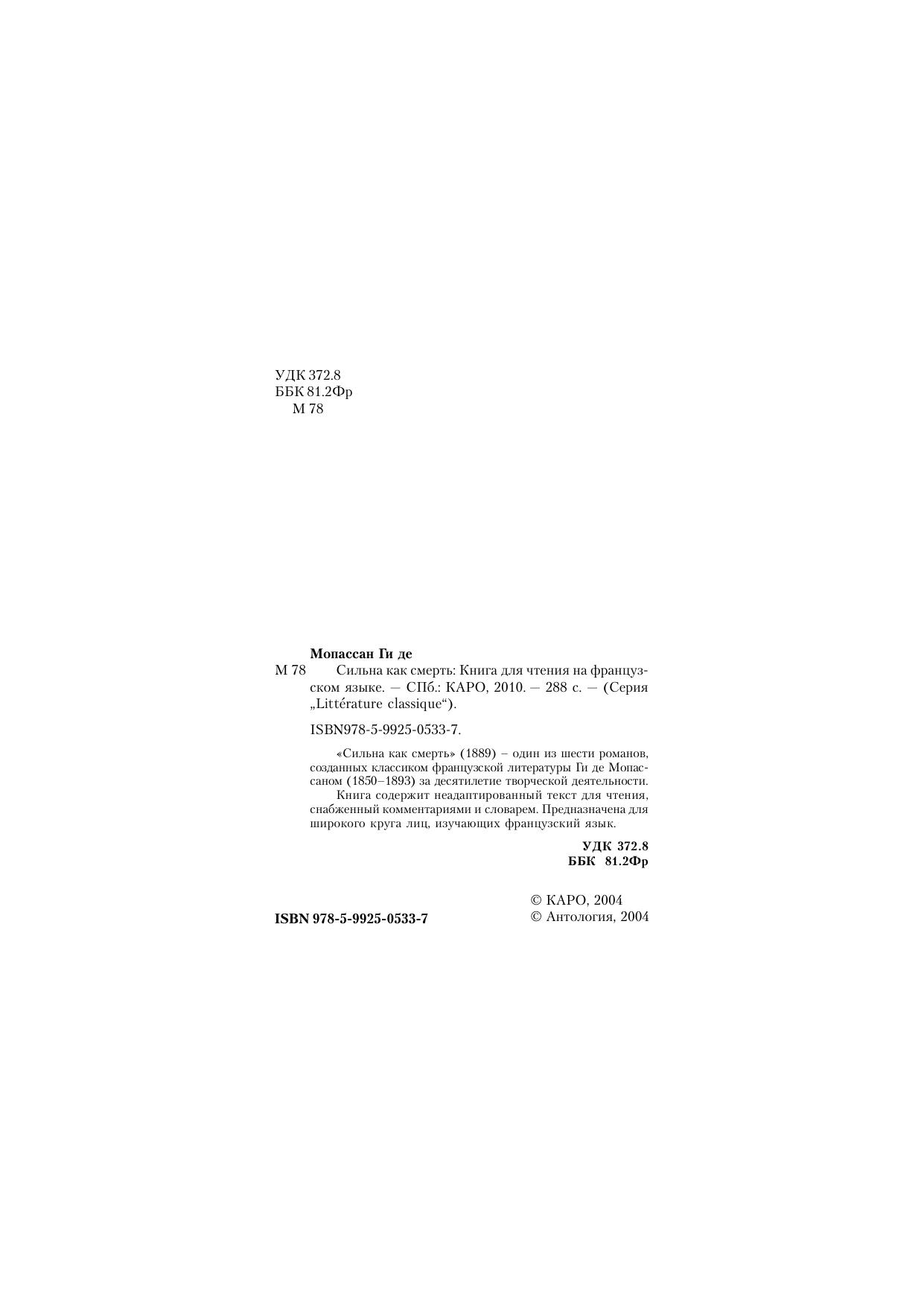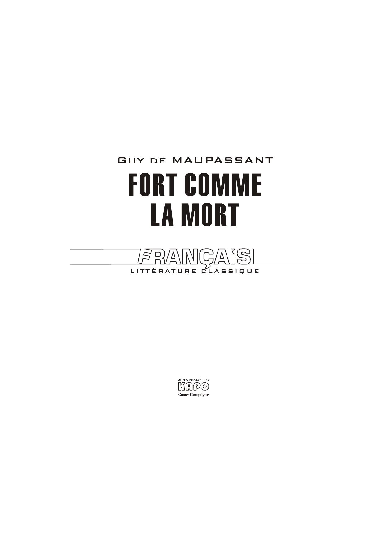 «Сильна как смерть» (1889) – один из шести романов, созданных классиком французской литературы Ги де Мопассаном (1850–1893) за десятилетие творческой деятельности. Книга содержит неадаптированный текст для чтения, снабженный комментариями и словарем. Предназначена для широкого круга лиц, изучающих французский язык.