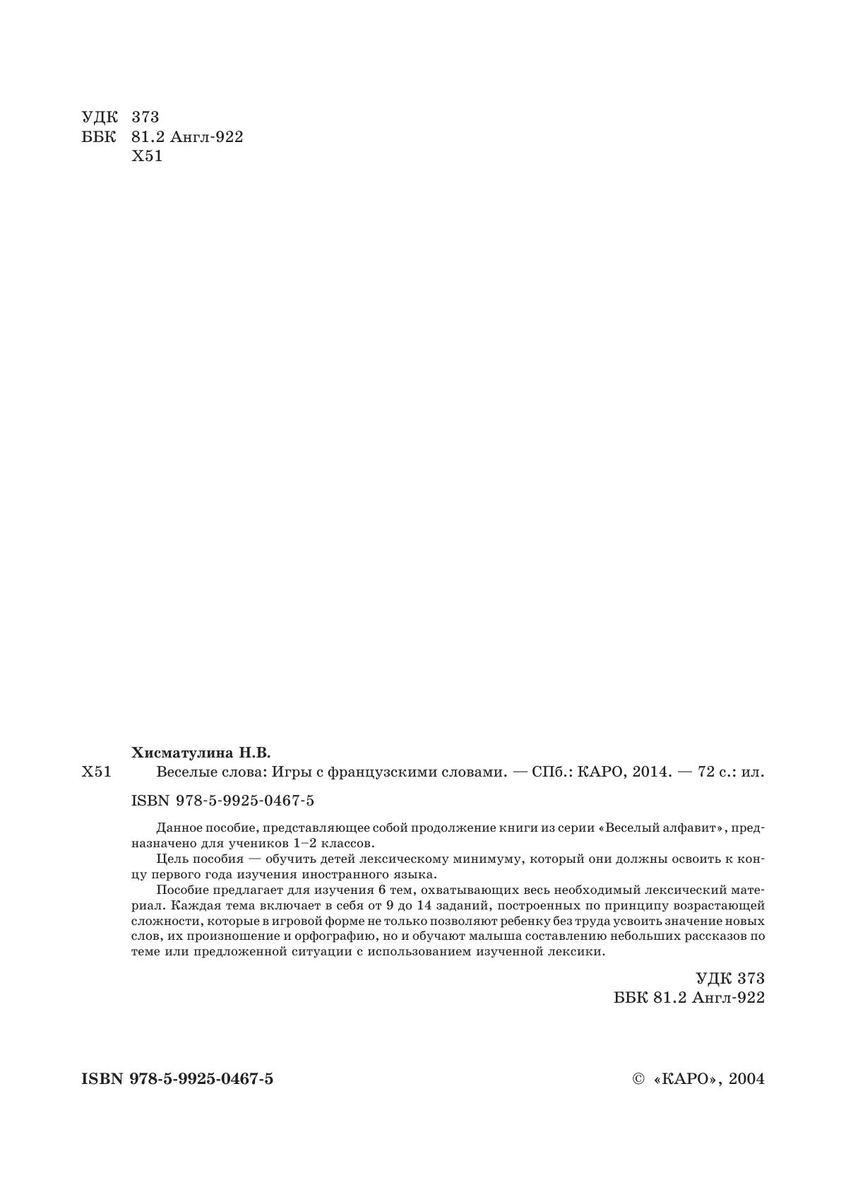 Данное пособие, представляющее собой продолжение книги из серии «Веселый алфавит», предназначено для учеников 1–2 классов. Цель пособия — обучить детей лексическому минимуму, который они должны освоить к концу первого года изучения иностранного языка. Пособие предлагает для изучения 6 тем, охватывающих весь необходимый лексический материал. Каждая тема включает в себя от 9 до 14 заданий, построенных по принципу возрастающей сложности, которые в игровой форме не только позволяют ребенку без труда усвоить значение новых слов, их произношение и орфографию, но и обучают малыша составлению небольших рассказов по теме или предложенной ситуации с использованием изученной лексики.