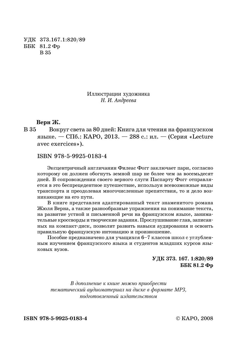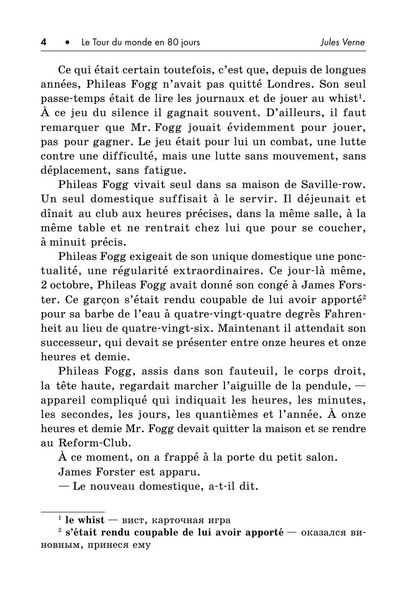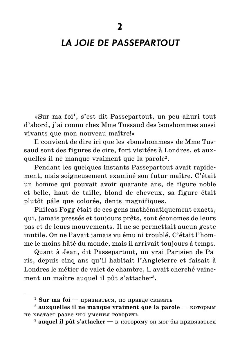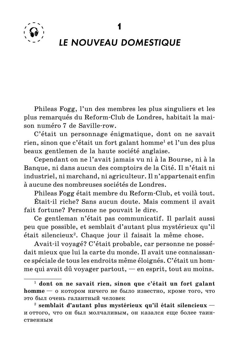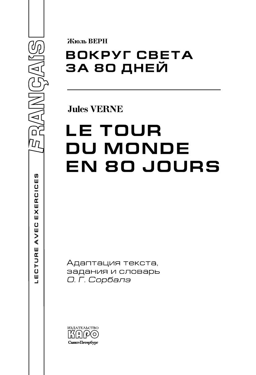 Эксцентричный англичанин Филеас Фогг заключает пари, согласно которому он должен обогнуть земной шар не более чем за восемьдесят дней. В сопровождении своего верного слуги Паспарту Фогг отправляется в это беспрецедентное путешествие, используя всевозможные виды транспорта и преодолевая многочисленные препятствия, то и дело возникающие на его пути.В книге представлен адаптированный текст знаменитого романа Жюля Верна, а также разнообразные упражнения на понимание текста, на развитие устной и письменной речи на французском языке, занимательные кроссворды и творческие задания. Прослушивание глав, записанных на компакт-диск, позволит развить навыки аудирования и освоить правильную французскую интонацию и произношение.Пособие предназначено для учащихся 6–7 классов школ с углубленным изучением французского языка и студентов младших курсов языковых вузов.
