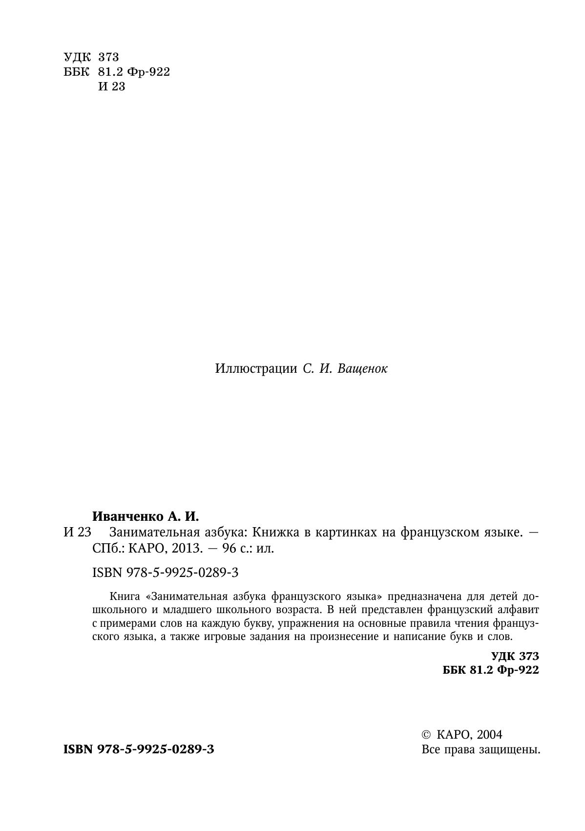 Книга «Занимательная азбука французского языка» предназначена для детей дошкольного и младшего школьного возраста. В ней представлен французский алфавит с примерами слов на каждую букву, упражнения на основные правила чтения французского языка, а также игровые задания на произнесение и написание букв и слов.