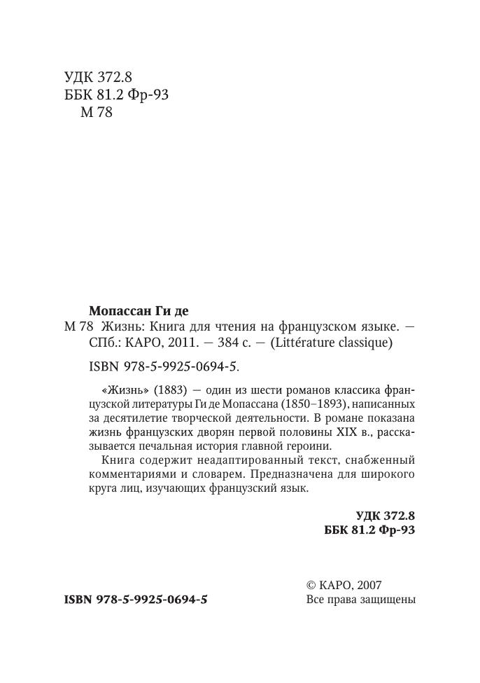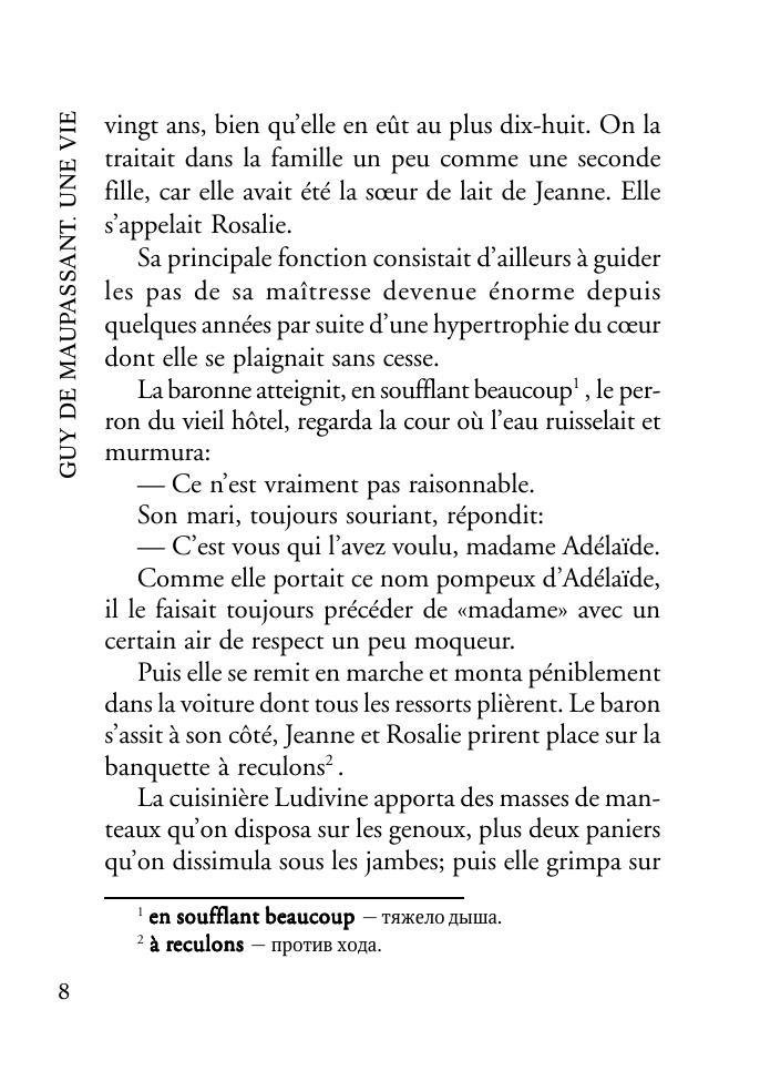 «Жизнь» (1883) — один из шести романов классика французской литературы Ги де Мопассана (1850–1893), написанных за десятилетие творческой деятельности. В романе показана жизнь французских дворян первой половины XIX в., рассказывается печальная история главной героини. Книга содержит неадаптированный текст, снабженный комментариями и словарем. Предназначена для широкого круга лиц, изучающих французский язык.