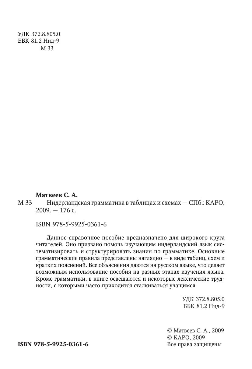 Данное справочное пособие предназначено для широкого круга читателей. Оно призвано помочь изучающим нидерландский язык систематизировать и структурировать знания по грамматике. Основные грамматические правила представлены наглядно — в виде таблиц, схем и кратких пояснений. Все объяснения даются на русском языке, что делает возможным использование пособия на разных этапах изучения языка. Кроме грамматики, в книге освещаются и некоторые лексические трудности, с которыми часто приходится сталкиваться учащимся.