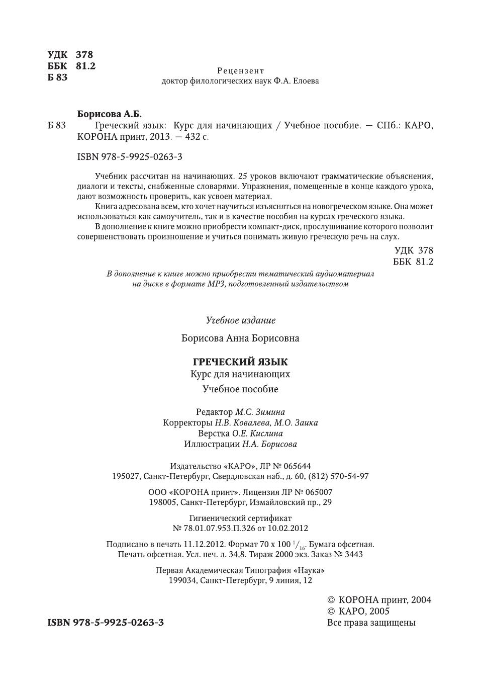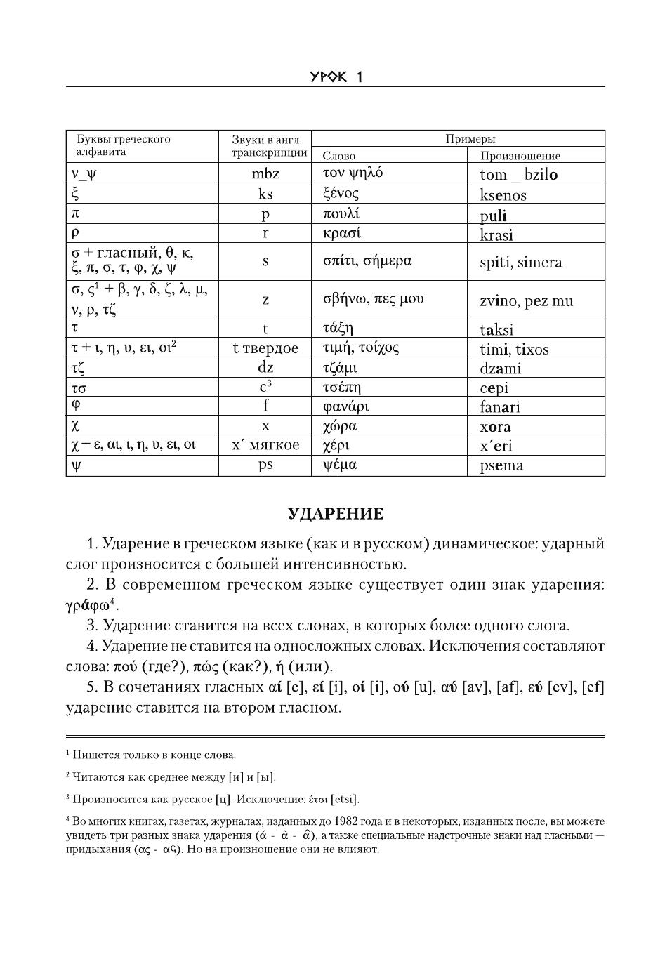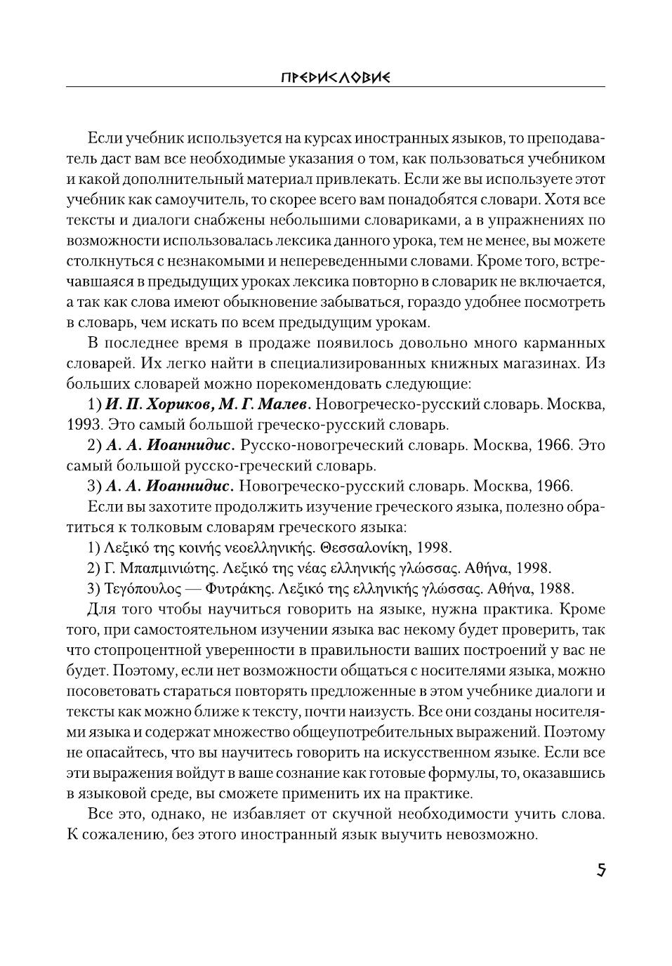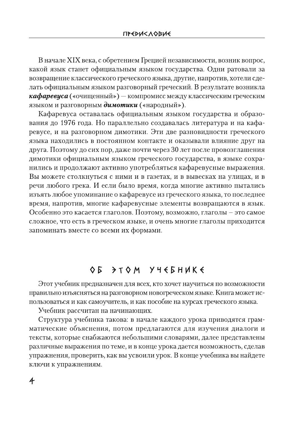 Учебник рассчитан на начинающих. 25 уроков включают грамматические объяснения, диалоги и тексты, снабженные словарями. Упражнения, помещенные в конце каждого урока, дают возможность проверить, как усвоен материал.Книга адресована всем, кто хочет научиться изъясняться на новогреческом языке. Она может использоваться как самоучитель, так и в качестве пособия на курсах греческого языка.Прослушивание компакт-диска позволит совершенствовать произношение и учиться понимать живую греческую речь на слух.