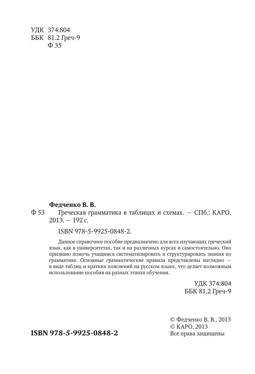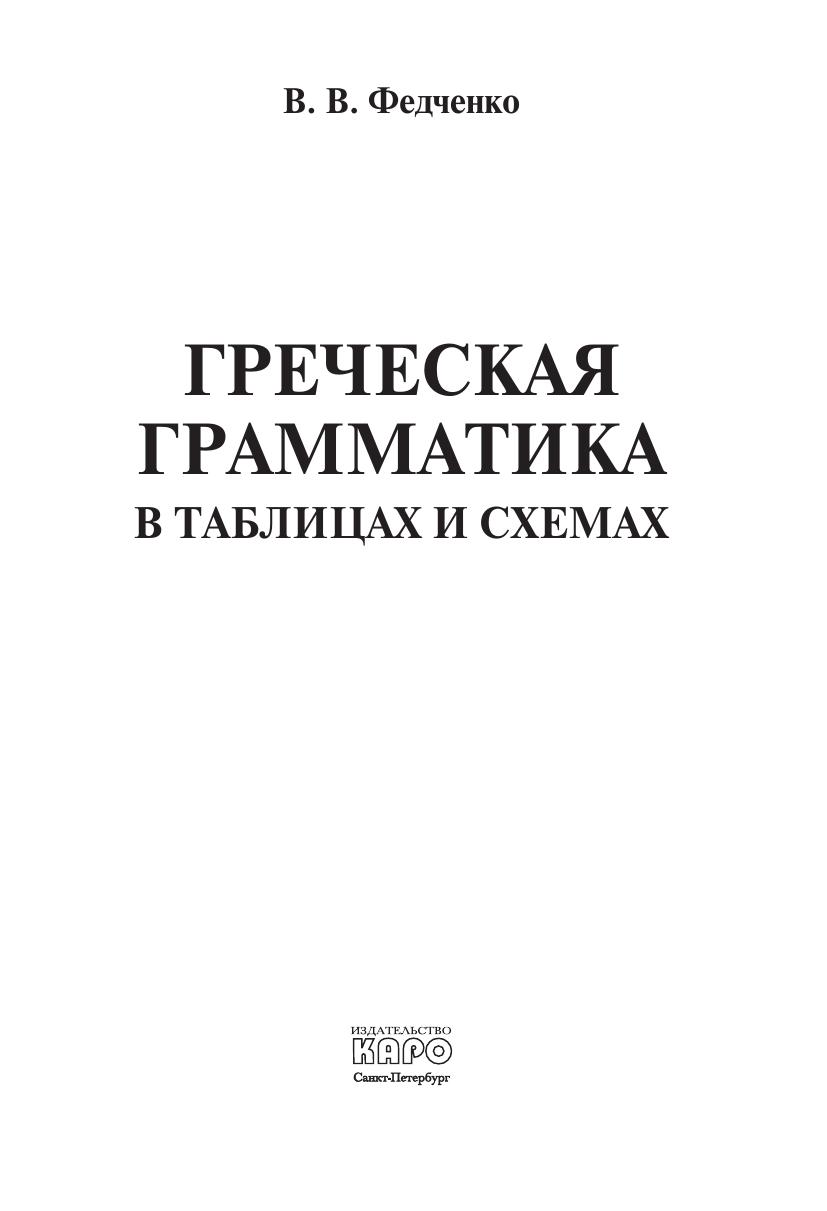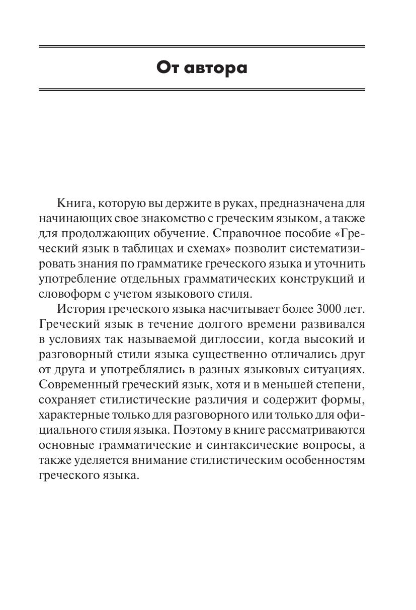 Данное справочное пособие предназначено для всех изучающих греческий язык, как в университетах, так и на различных курсах и самостоятельно. Оно призвано помочь учащимся систематизировать и структурировать знания по грамматике. Основные грамматические правила представлены наглядно — в виде таблиц и кратких пояснений на русском языке, что делает возможным использование пособия на разных этапах обучения.