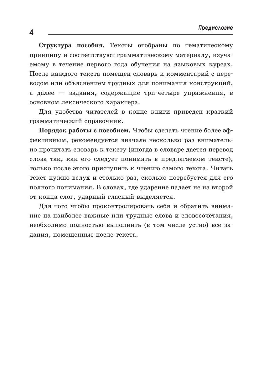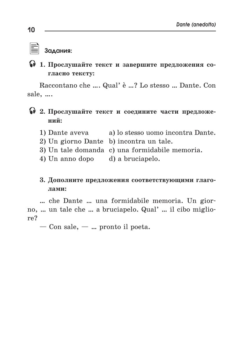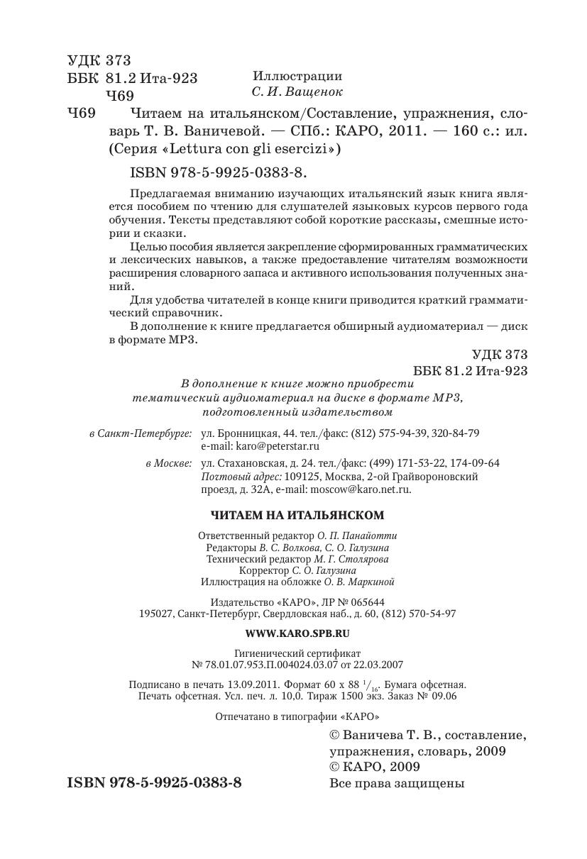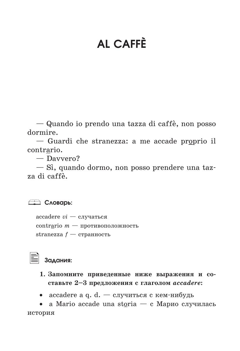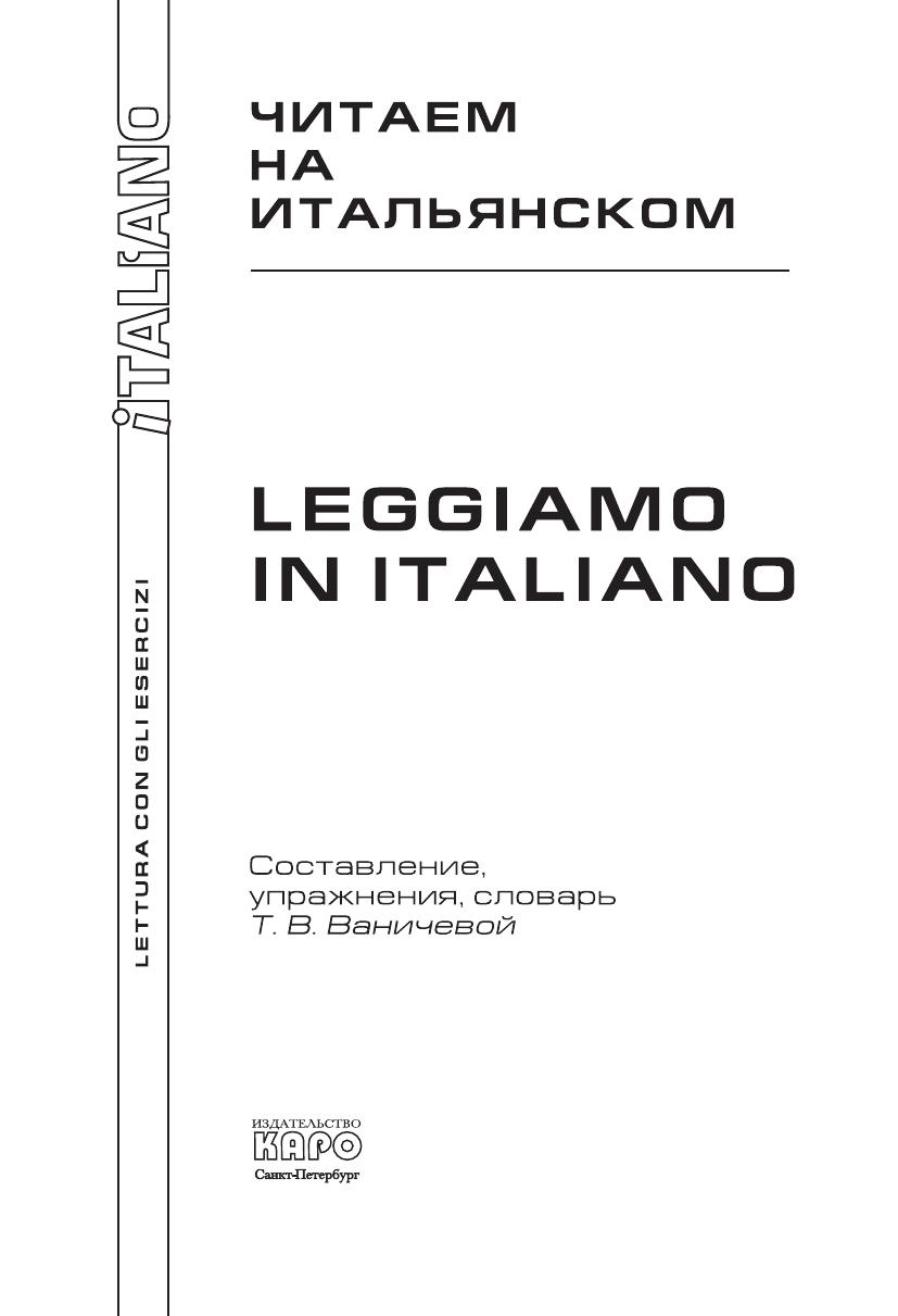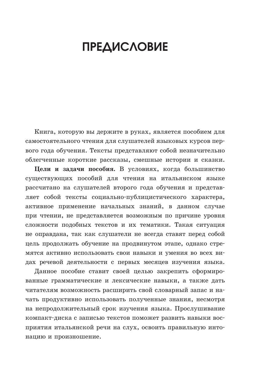 Предлагаемая вниманию изучающих итальянский язык книга является пособием по чтению для слушателей языковых курсов первого года обучения. Тексты представляют собой короткие рассказы, смешные истории и сказки. Целью пособия является закрепление сформированных грамматических и лексических навыков, а также предоставление читателям возможности расширения словарного запаса и активного использования полученных знаний. Для удобства читателей в конце книги приводится краткий грамматический справочник. В дополнение к книге предлагается обширный аудиоматериал — диск в формате МР3.