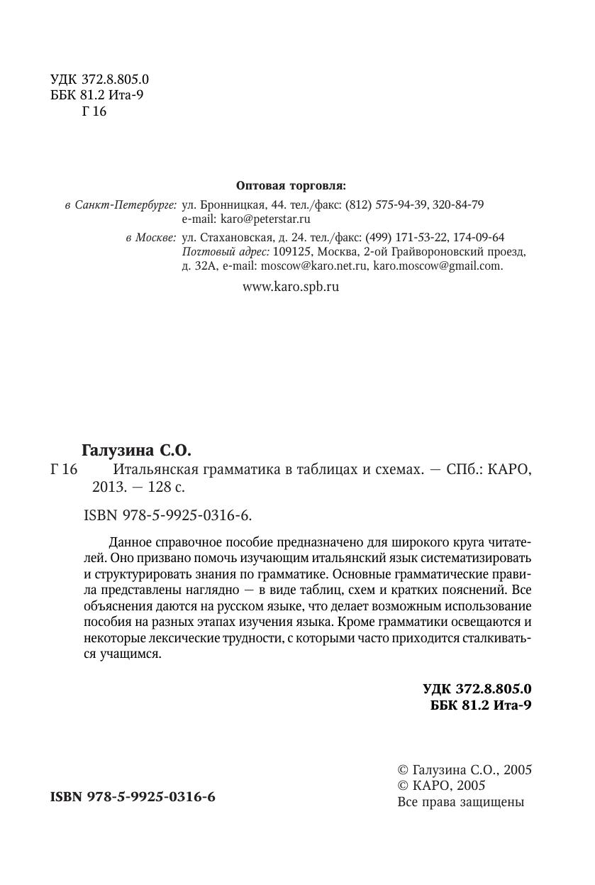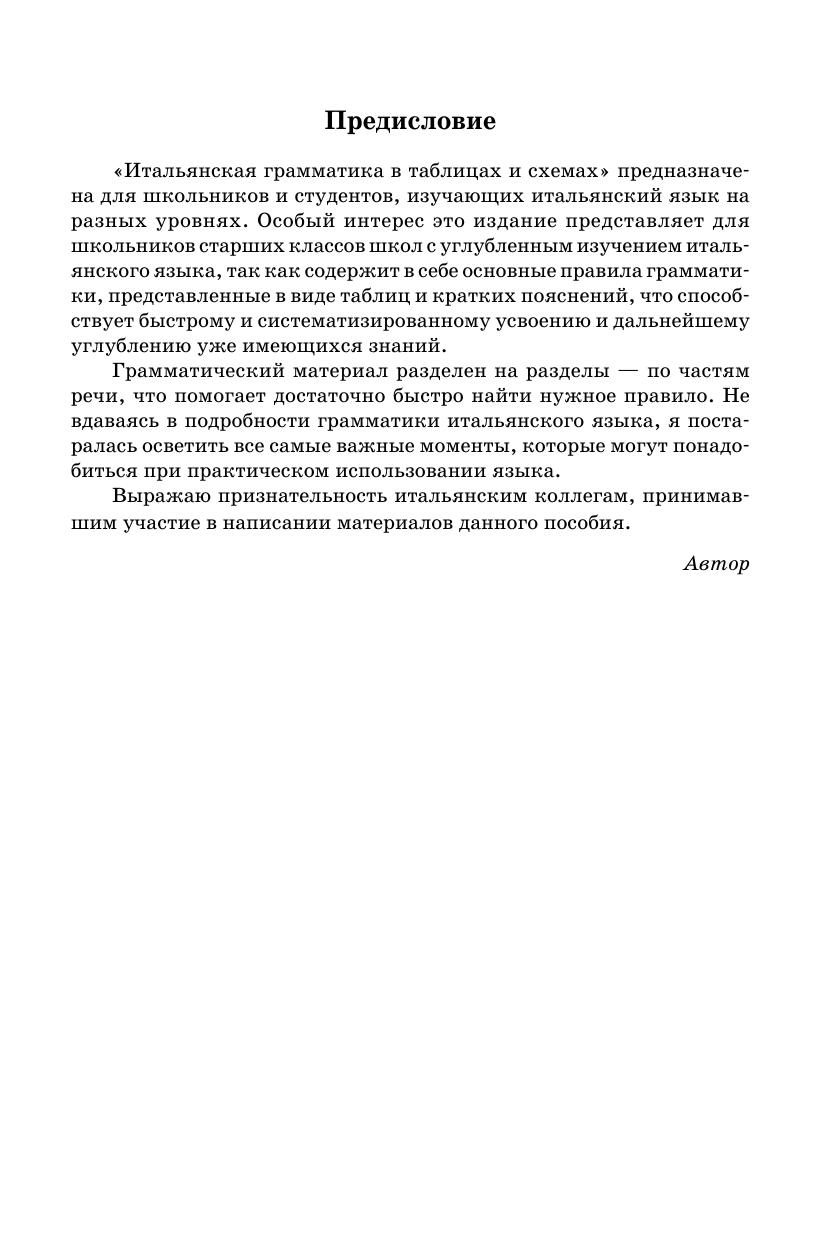 Данное справочное пособие предназначено для широкого круга читателей. Оно призвано помочь изучающим итальянский язык систематизировать и структурировать знания по грамматике. Основные грамматические правила представлены наглядно — в виде таблиц, схем и кратких пояснений. Все объяснения даются на русском языке, что делает возможным использование пособия на разных этапах изучения языка. Кроме грамматики освещаются и некоторые лексические трудности, с которыми часто приходится сталкиваться учащимся.