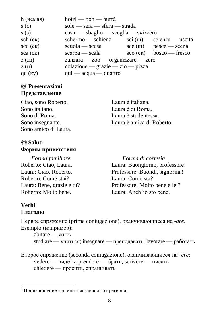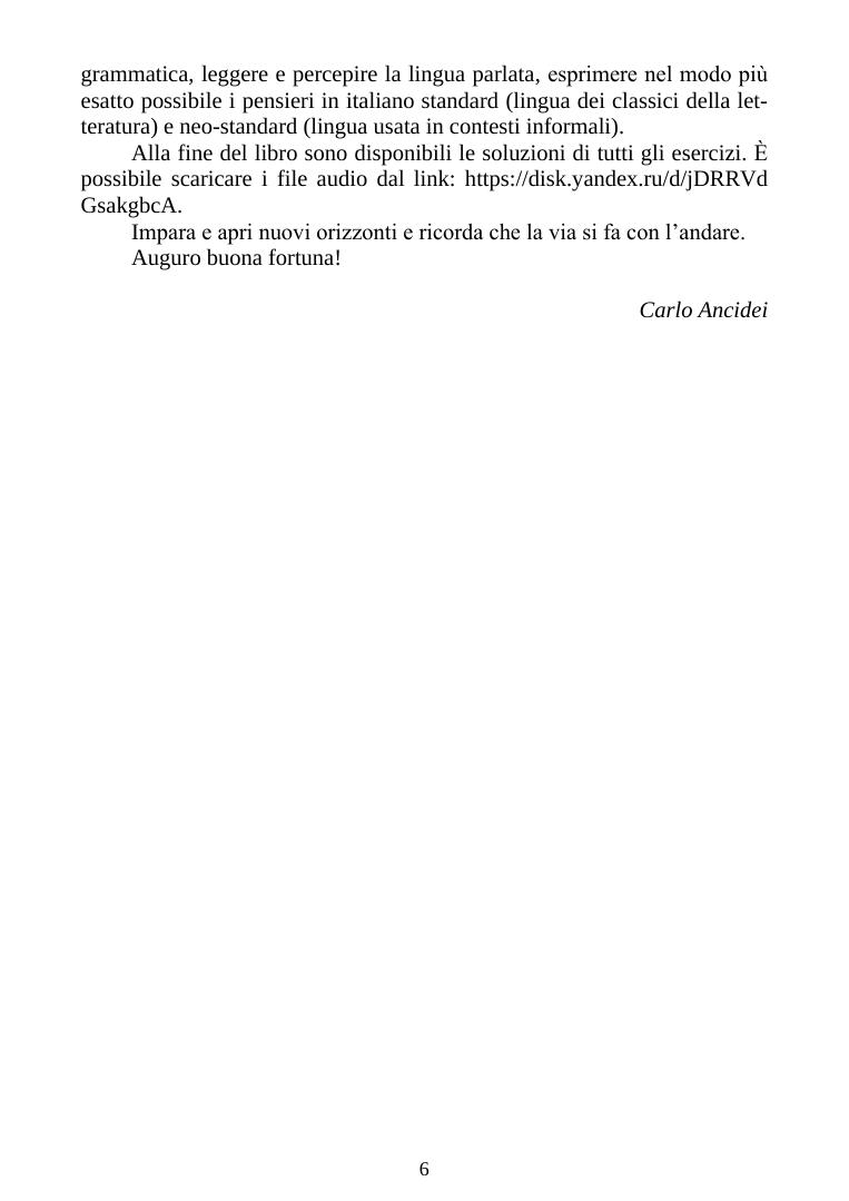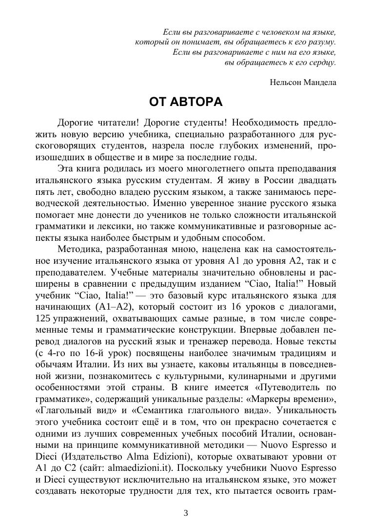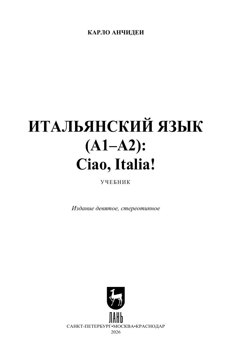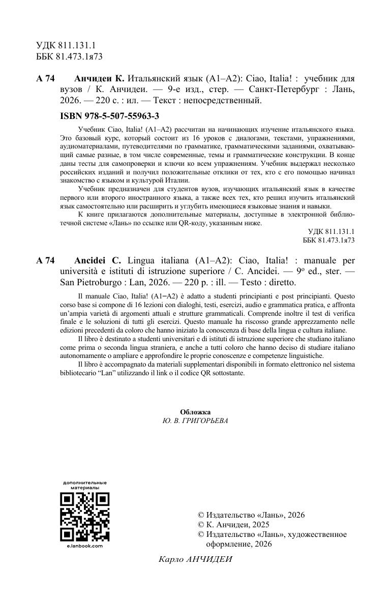 Учебник Ciao, Italia! (А1–А2) рассчитан на начинающих изучение итальянского языка. Это базовый курс, который состоит из 16 уроков с диалогами, текстами, упражнениями, аудиоматериалами, путеводителями по грамматике, грамматическими заданиями, охватывающий самые разные, в том числе современные, темы и грамматические конструкции. В конце даны тесты для самопроверки и ключи ко всем упражнениям. Учебник выдержал несколько российских изданий и получил положительные отклики от тех, кто с его помощью начинал знакомство с языком и культурой Италии. Учебник предназначен для студентов вузов, изучающих итальянский язык в качестве первого или второго иностранного языка, а также всех тех, кто решил изучить итальянский язык самостоятельно или расширить и углубить имеющиеся языковые знания и навыки. К книге прилагаются дополнительные материалы, доступные в электронной библиотечной системе «Лань» по ссылке или QR-коду, указанным ниже. Il manuale Ciao, Italia! (A1–A2) è adatto a studenti principianti e post principianti. Questo corso base si compone di 16 lezioni con dialoghi, testi, esercizi, audio e grammatica pratica, e affronta un’ampia varietà di argomenti attuali e strutture grammaticali. Comprende inoltre il test di verifica finale e le soluzioni di tutti gli esercizi. Questo manuale ha riscosso grande apprezzamento nelle edizioni precedenti da coloro che hanno iniziato la conoscenza di base della lingua e cultura italiane. Il libro è destinato a studenti universitari e di istituti di istruzione superiore che studiano italiano come prima o seconda lingua straniera, e anche a tutti coloro che hanno deciso di studiare italiano autonomamente o ampliare e approfondire le proprie conoscenze e competenze linguistiche. Il libro è accompagnato da materiali supplementari disponibili in formato elettronico nel sistema bibliotecario “Lan” utilizzando il link o il codice QR sottostante.
