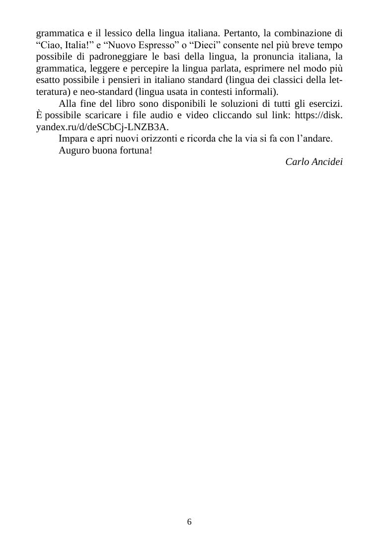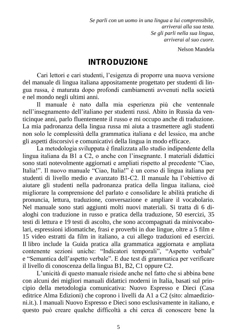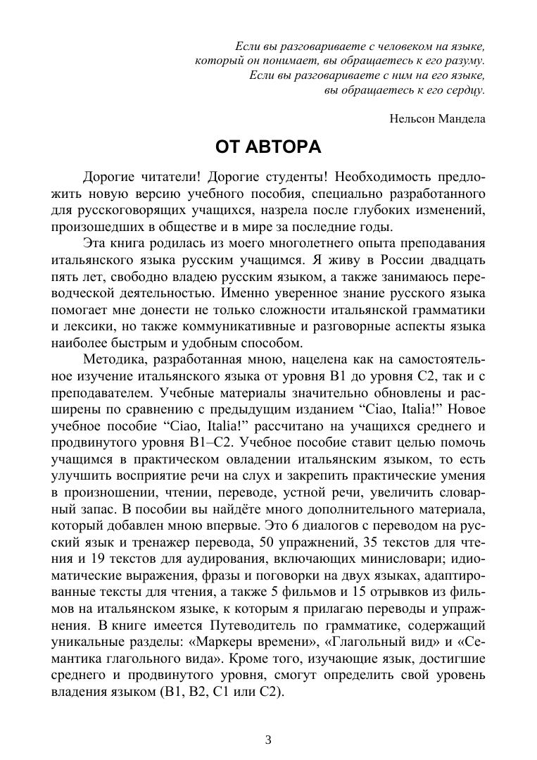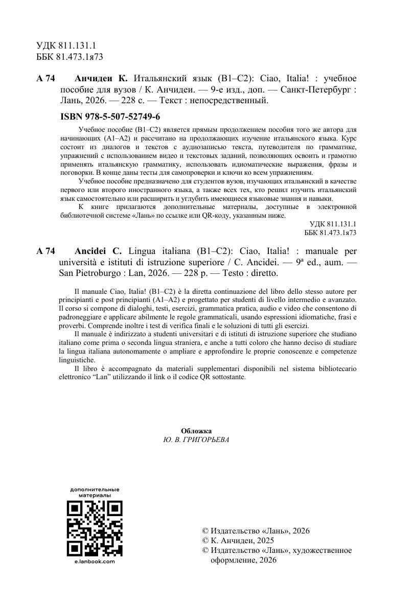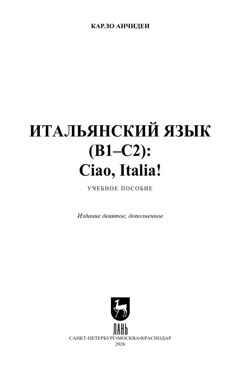 Учебное пособие (В1–С2) является прямым продолжением пособия того же автора для начинающих (А1–А2) и рассчитано на продолжающих изучение итальянского языка. Курс состоит из диалогов и текстов с аудиозаписью текста, путеводителя по грамматике, упражнений с использованием видео и текстовых заданий, позволяющих освоить и грамотно применять итальянскую грамматику, использовать идиоматические выражения, фразы и поговорки. В конце даны тесты для самопроверки и ключи ко всем упражнениям. Учебное пособие предназначено для студентов вузов, изучающих итальянский в качестве первого или второго иностранного языка, а также всех тех, кто решил изучить итальянский язык самостоятельно или расширить и углубить имеющиеся языковые знания и навыки. К книге прилагаются дополнительные материалы, доступные в электронной библиотечной системе «Лань» по ссылке или QR-коду, указанным ниже. Il manuale Ciao, Italia! (B1–C2) è la diretta continuazione del libro dello stesso autore per principianti e post principianti (A1–A2) e progettato per studenti di livello intermedio e avanzato. Il corso si compone di dialoghi, testi, esercizi, grammatica pratica, audio e video che consentono di padroneggiare e applicare abilmente le regole grammaticali, usando espressioni idiomatiche, frasi e proverbi. Comprende inoltre i test di verifica finali e le soluzioni di tutti gli esercizi. Il manuale è indirizzato a studenti universitari e di istituti di istruzione superiore che studiano italiano come prima o seconda lingua straniera, e anche a tutti coloro che hanno deciso di studiare la lingua italiana autonomamente o ampliare e approfondire le proprie conoscenze e competenze linguistiche. Il libro è accompagnato da materiali supplementari disponibili nel sistema bibliotecario elettronico “Lan” utilizzando il link o il codice QR sottostante.