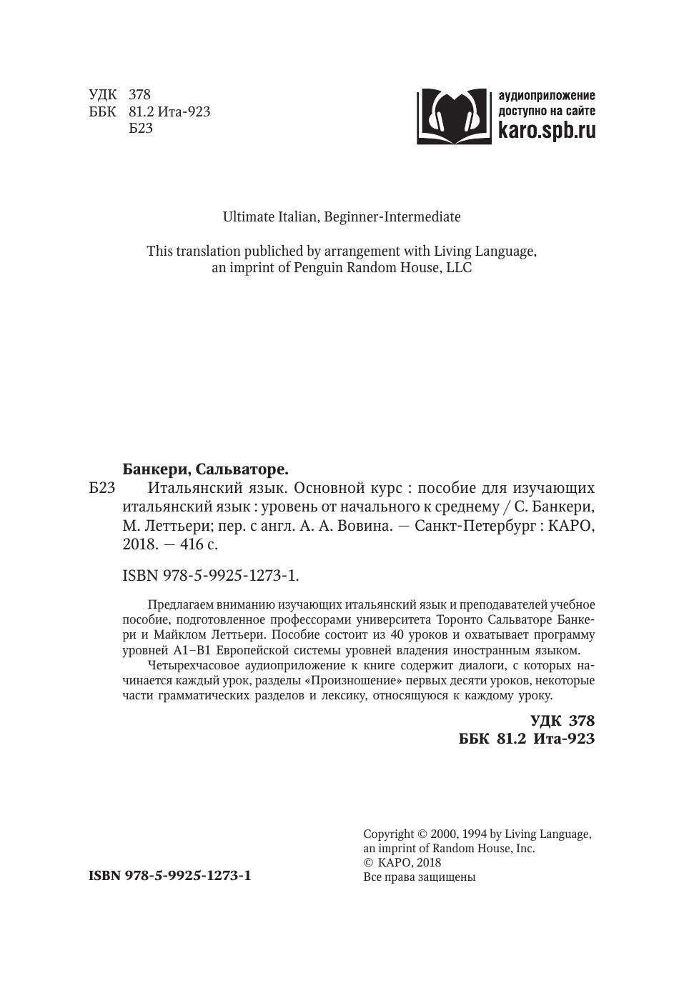 Предлагаем вниманию изучающих итальянский язык и преподавателей учебное пособие, подготовленное профессорами университета Торонто Сальваторе Банкери и Майклом Леттьери. Пособие состоит из 40 уроков и охватывает программу уровней А1–В1 Европейской системы уровней владения иностранным языком. Четырехчасовое аудиоприложение к книге содержит диалоги, с которых начинается каждый урок, разделы «Произношение» первых десяти уроков, некоторые части грамматических разделов и лексику, относящуюся к каждому уроку.
