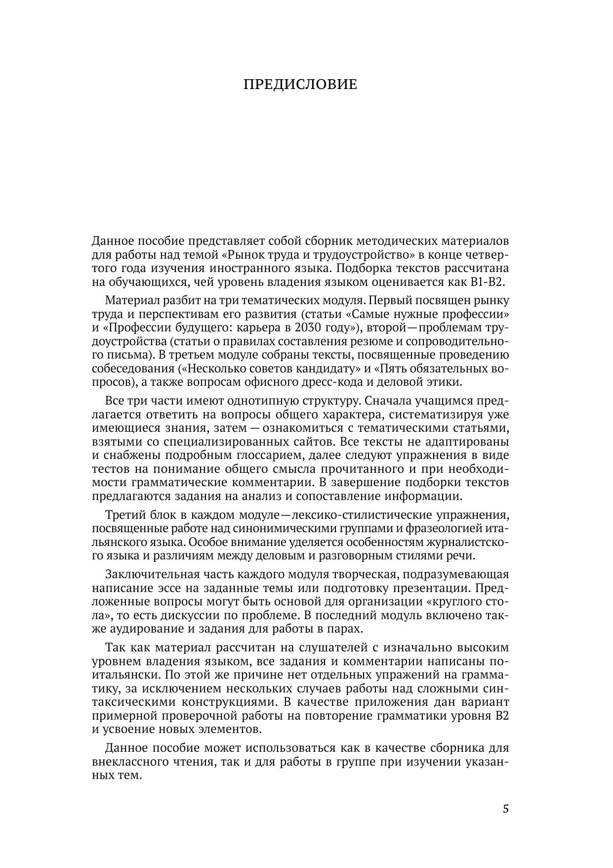 Данное пособие представляет собой сборник методических материалов для работы над темой «Рынок труда и трудоустройство» в конце четвертого года изучения иностранного языка. Подборка текстов рассчитана на обучающихся, чей уровень владения языком оценивается как В1-В2. Все тексты не адаптированы и снабжены подробным глоссарием, далее следуют упражнения в виде текстов на понимание общего смысла прочитанного и при необходимости грамматические комментарии. В завершение подборки тестов предлагаются задания на анализ и сопоставление информации. Данное пособие может использоваться как в качестве сборника для внеклассного чтения, так и для работы в группе при изучении указанных тем.