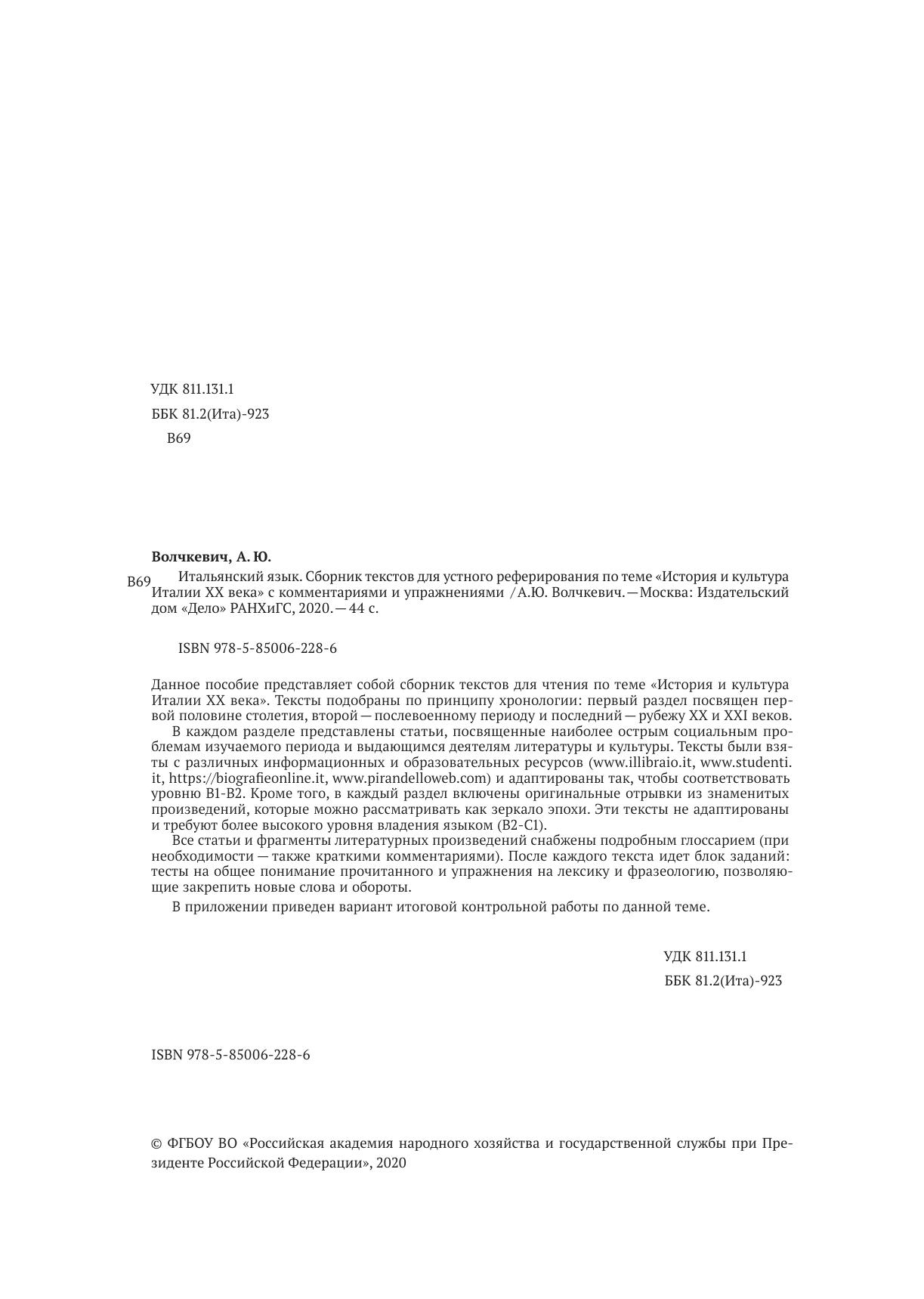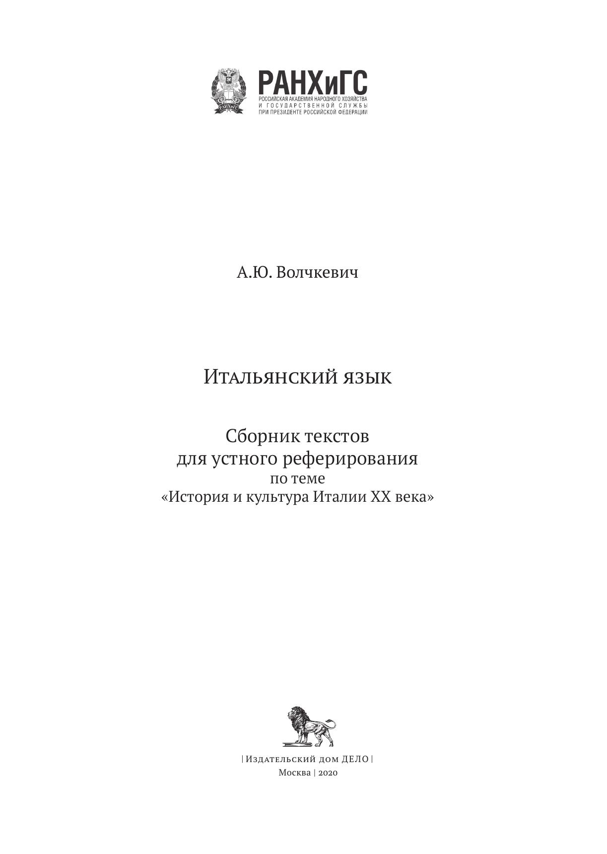 Данное пособие представляет собой сборник текстов для чтения по теме «История и культура Италии ХХ века». Тексты подобраны по принципу хронологии: первый раздел посвящен первой половине столетия, второй — послевоенному периоду и последний — рубежу ХХ и ХХI веков. В каждом разделе представлены статьи, посвященные наиболее острым социальным проблемам изучаемого периода и выдающимся деятелям литературы и культуры. Тексты были взя- ты с различных информационных и образовательных ресурсов (www.illibraio.it, www.studenti. it, https://biografieonline.it, www.pirandelloweb.com) и адаптированы так, чтобы соответствовать уровню В1-В2. Кроме того, в каждый раздел включены оригинальные отрывки из знаменитых произведений, которые можно рассматривать как зеркало эпохи. Эти тексты не адаптированы и требуют более высокого уровня владения языком (В2-С1). Все статьи и фрагменты литературных произведений снабжены подробным глоссарием (при необходимости — также краткими комментариями). После каждого текста идет блок заданий: тесты на общее понимание прочитанного и упражнения на лексику и фразеологию, позволяющие закрепить новые слова и обороты. В приложении приведен вариант итоговой контрольной работы по данной теме.