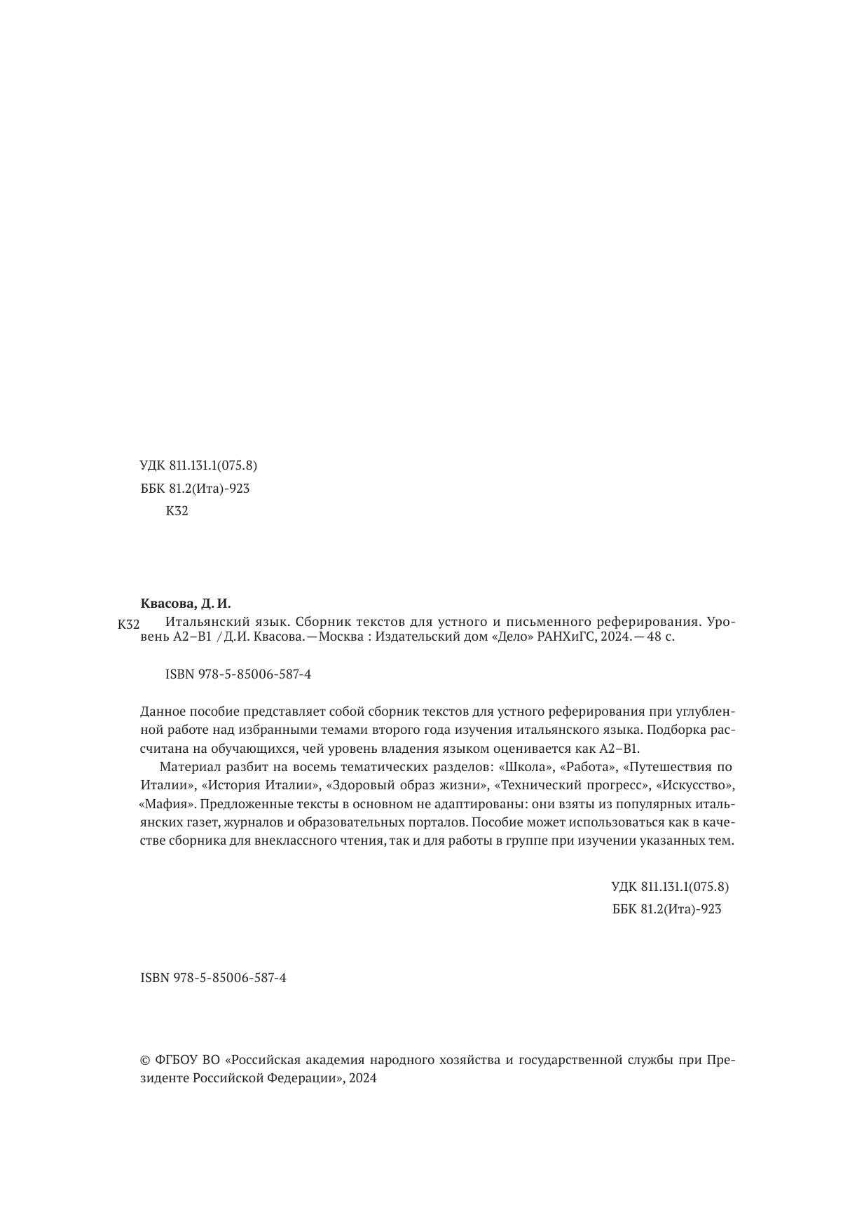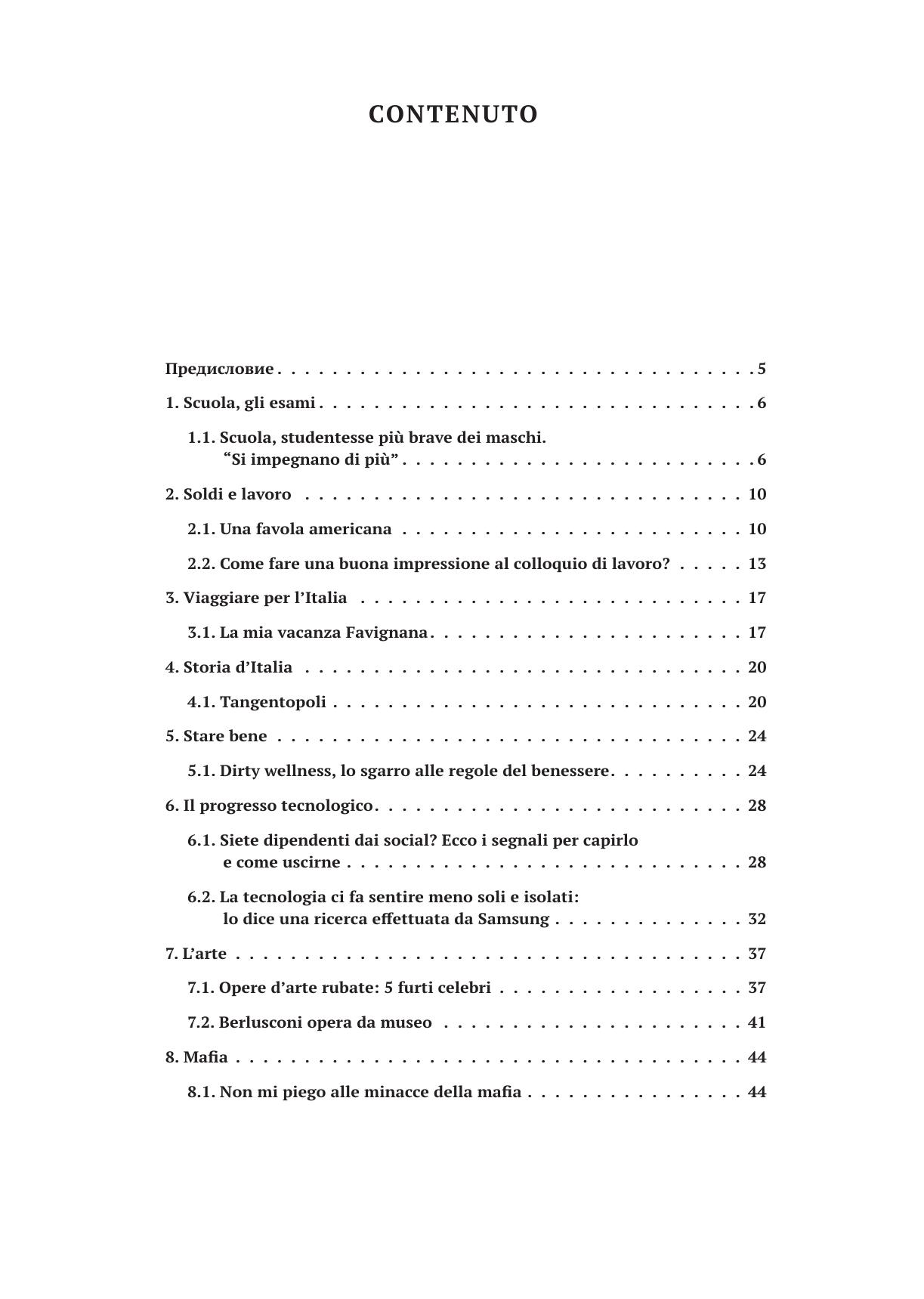 Данное пособие представляет собой сборник текстов для устного реферирования при углубленной работе над избранными темами второго года изучения итальянского языка. Подборка рассчитана на обучающихся, чей уровень владения языком оценивается как A2–B1. Материал разбит на восемь тематических разделов: «Школа», «Работа», «Путешествия по Италии», «История Италии», «Здоровый образ жизни», «Технический прогресс», «Искусство», «Мафия». Предложенные тексты в основном не адаптированы: они взяты из популярных итальянских газет, журналов и образовательных порталов. Пособие может использоваться как в качестве сборника для внеклассного чтения, так и для работы в группе при изучении указанных тем.