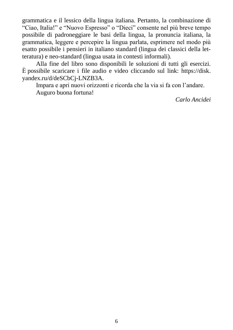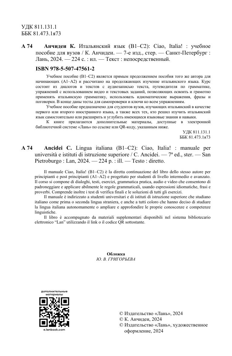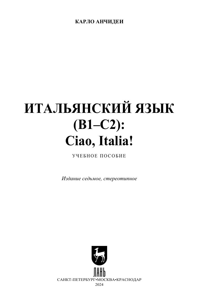 Учебное пособие (В1–С2) является прямым продолжением пособия того же автора для начинающих (А1–А2) и рассчитано на продолжающих изучение итальянского языка. Курс состоит из диалогов и текстов с аудиозаписью текста, путеводителя по грамматике, упражнений с использованием видео и текстовых заданий, позволяющих освоить и грамотно применять итальянскую грамматику, использовать идиоматические выражения, фразы и поговорки. В конце даны тесты для самопроверки и ключи ко всем упражнениям. Учебное пособие предназначено для студентов вузов, изучающих итальянский в качестве первого или второго иностранного языка, а также всех тех, кто решил изучить итальянский язык самостоятельно или расширить и углубить имеющиеся языковые знания и навыки. К книге прилагаются дополнительные материалы, доступные в электронной библиотечной системе «Лань» по ссылке или QR-коду, указанным ниже. Il manuale Ciao, Italia! (B1–C2) è la diretta continuazione del libro dello stesso autore per principianti e post principianti (A1–A2) e progettato per studenti di livello intermedio e avanzato. Il corso si compone di dialoghi, testi, esercizi, grammatica pratica, audio e video che consentono di padroneggiare e applicare abilmente le regole grammaticali, usando espressioni idiomatiche, frasi e proverbi. Comprende inoltre i test di verifica finali e le soluzioni di tutti gli esercizi. Il manuale è indirizzato a studenti universitari e di istituti di istruzione superiore che studiano italiano come prima o seconda lingua straniera, e anche a tutti coloro che hanno deciso di studiare la lingua italiana autonomamente o ampliare e approfondire le proprie conoscenze e competenze linguistiche. Il libro è accompagnato da materiali supplementari disponibili nel sistema bibliotecario elettronico “Lan” utilizzando il link o il codice QR sottostante.