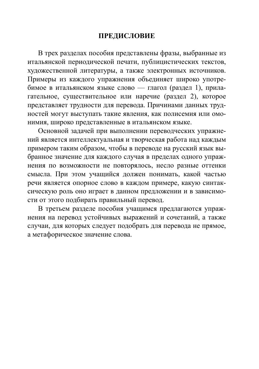 Настоящее пособие представляет собой сборник упражнений, направленных на разработку навыков письменного перевода с итальянского языка на русский на материале аутентичных итальянских источников, подобранных таким образом, чтобы как можно шире раскрыть многозначность итальянской лексики, представить наиболее употребительные слова в различных контекстах, помочь учащимся распознавать случаи омонимии в итальянском языке, а также значительно повысить словарный запас.