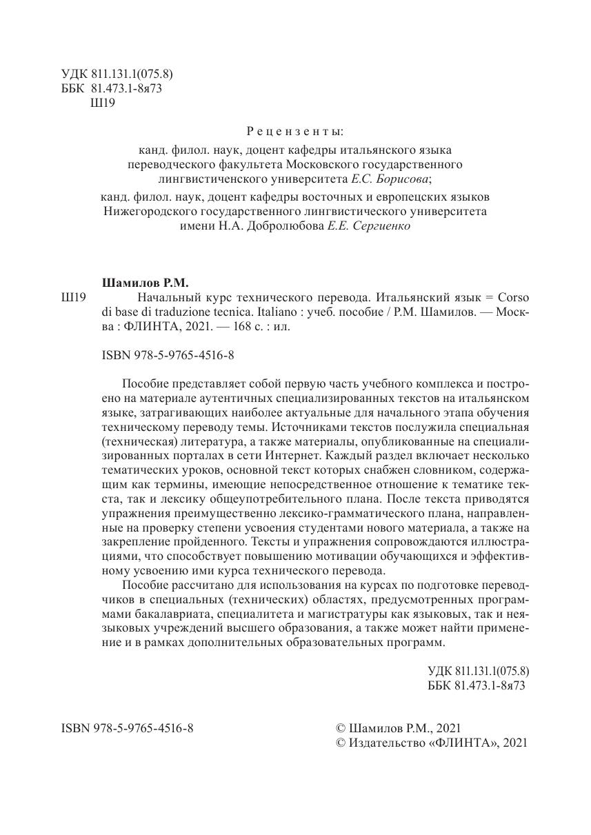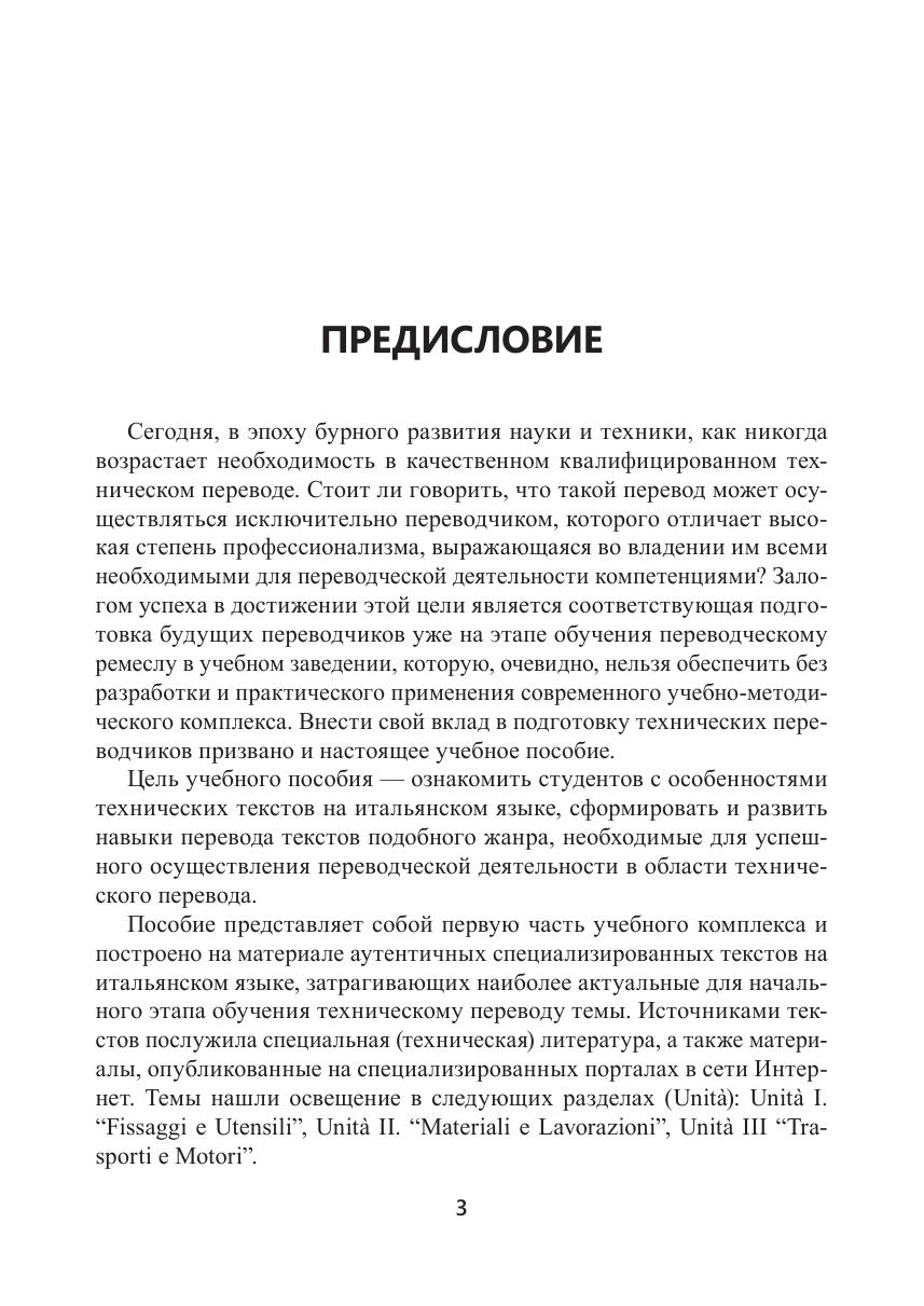 Пособие представляет собой первую часть учебного комплекса и построено на материале аутентичных специализированных текстов на итальянском языке, затрагивающих наиболее актуальные для начального этапа обучения техническому переводу темы. Источниками текстов послужила специальная (техническая) литература, а также материалы, опубликованные на специализированных порталах в сети Интернет. Каждый раздел включает несколько тематических уроков, основной текст которых снабжен словником, содержащим как термины, имеющие непосредственное отношение к тематике текста, так и лексику общеупотребительного плана. После текста приводятся упражнения преимущественно лексико-грамматического плана, направленные на проверку степени усвоения студентами нового материала, а также на закрепление пройденного. Тексты и упражнения сопровождаются иллюстрациями, что способствует повышению мотивации обучающихся и эффективному усвоению ими курса технического перевода.
