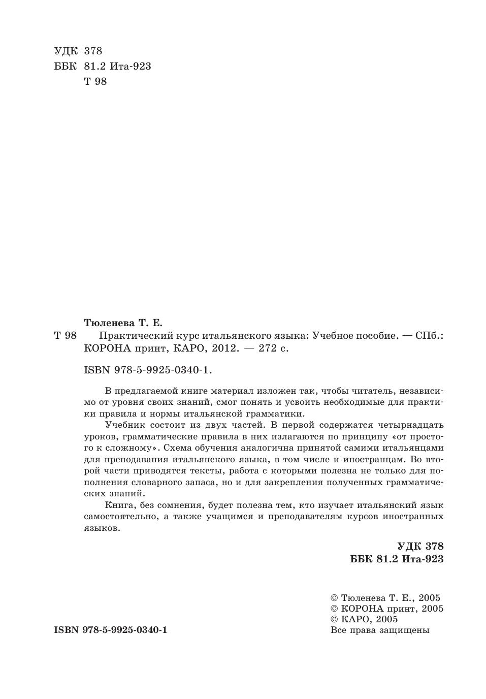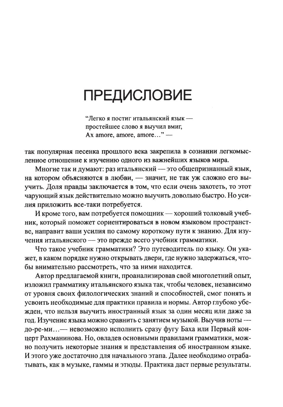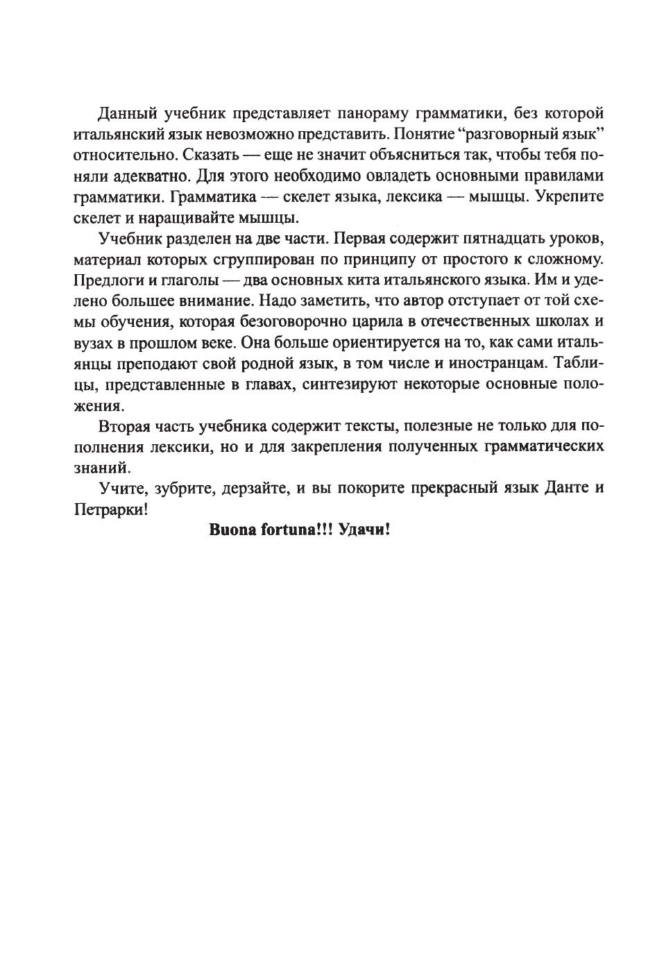 В предлагаемой книге материал изложен так, чтобы читатель, независимо от уровня своих знаний, смог понять и усвоить необходимые для практики правила и нормы итальянской грамматики. Учебник состоит из двух частей. В первой содержатся четырнадцать уроков, грамматические правила в них излагаются по принципу «от простого к сложному». Схема обучения аналогична принятой самими итальянцами для преподавания итальянского языка, в том числе и иностранцам. Во второй части приводятся тексты, работа с которыми полезна не только для пополнения словарного запаса, но и для закрепления полученных грамматических знаний. Книга, без сомнения, будет полезна тем, кто изучает итальянский язык самостоятельно, а также учащимся и преподавателям курсов иностранных языков.