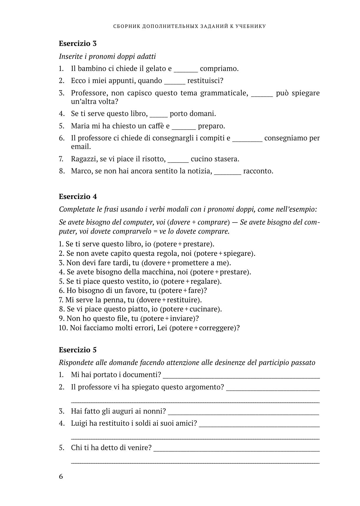 Данное учебное пособие является продолжением аналогичного сборника упражнений для начального уровня и сохраняет его структуру и методическую направленность. Пособие предназначено для студентов бакалавриата ИОН РАНХиГС и содержит дополнительные задания к основному учебнику, который используется для изучения итальянского языка на 2, 3 и 4-м курсах. Каждый юнит включает в себя около десяти упражнений на грамматику и столько же на лексику и развитие речевых навыков. Акцент делается на темах и нюансах, вызывающих особую сложность у русских студентов. Присутствует также некоторое количество заданий на перевод с русского языка на итальянский. В пособии отсутствуют задания к юниту 4 учебника, поскольку он не включен в утвержденную рабочую программу итальянского языка в Академии. Упражнения из данного пособия могут использоваться как преподавателями для более углубленного изучения тем, представленных в базовом учебнике, так и студентами для закрепления пройденного материала и подготовки к письменным контрольным работам.