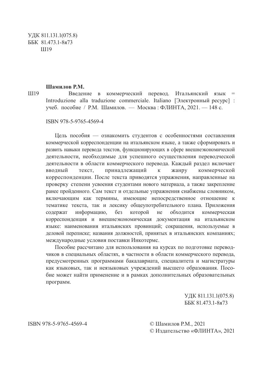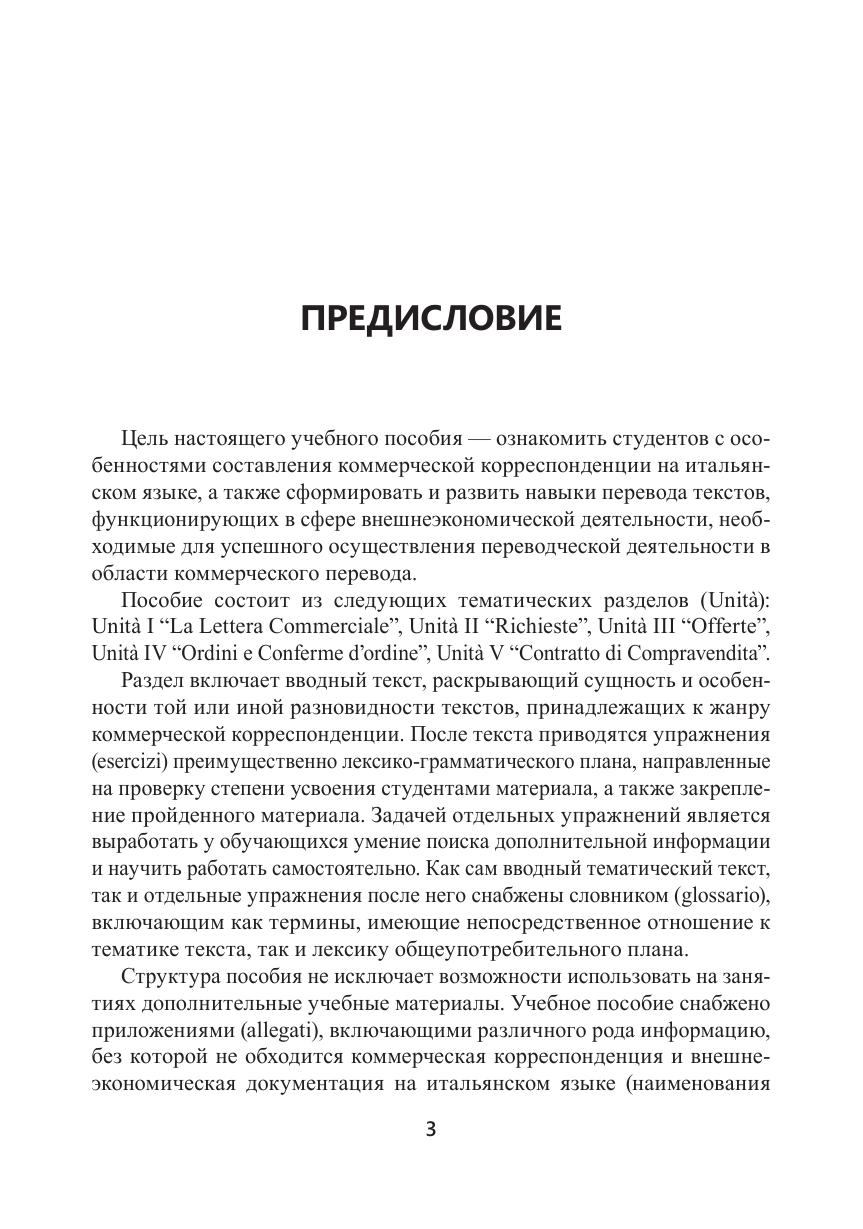 Цель пособия — ознакомить студентов с особенностями составления коммерческой корреспонденции на итальянском языке, а также сформировать и развить навыки перевода текстов, функционирующих в сфере внешнеэкономической деятельности, необходимые для успешного осуществления переводческой деятельности в области коммерческого перевода. Каждый раздел включает вводный текст, принадлежащий к жанру коммерческой корреспонденции. После текста приводятся упражнения, направленные на проверку степени усвоения студентами нового материала, а также закрепление ранее пройденного. Сам текст и отдельные упражнения снабжены словником, включающим как термины, имеющие непосредственное отношение к тематике текста, так и лексику общеупотребительного плана. Приложения содержат информацию, без которой не обходится коммерческая корреспонденция и внешнеэкономическая документация на итальянском языке: наименования итальянских провинций; сокращения, используемые в деловой переписке; названия должностей, принятых в итальянских компаниях; международные условия поставки Инкотермс.
