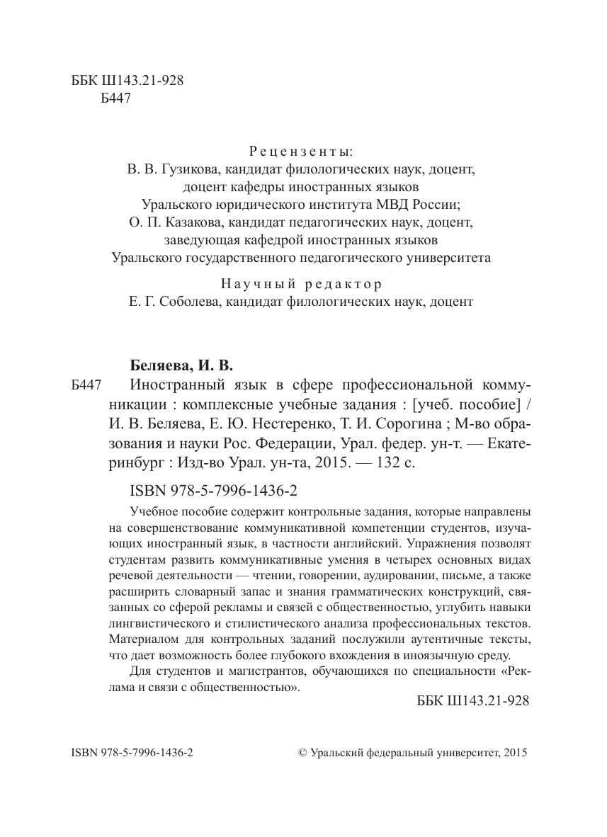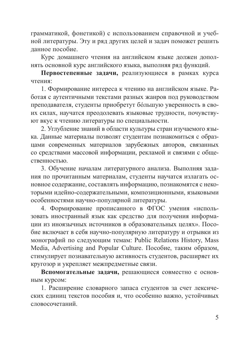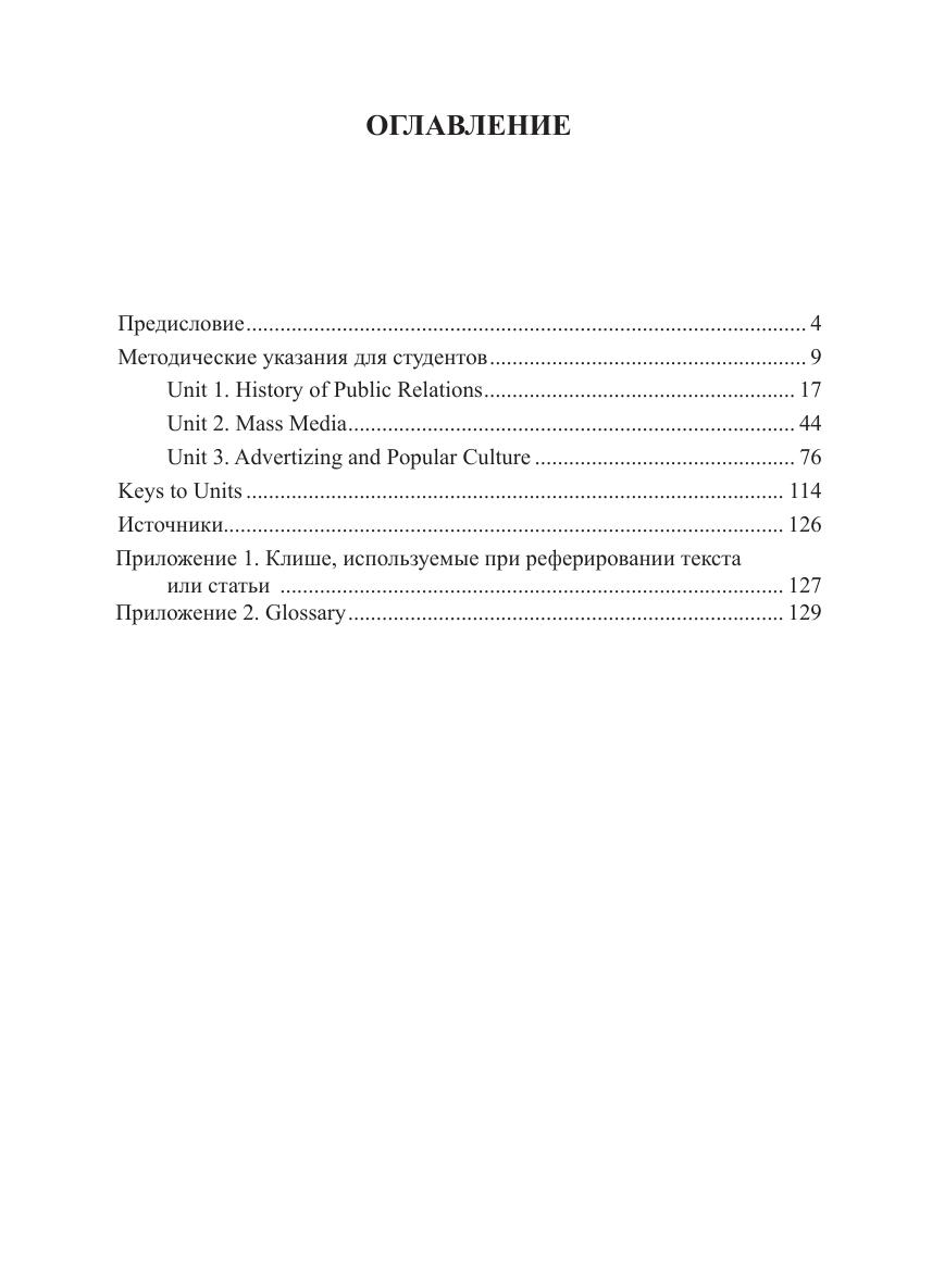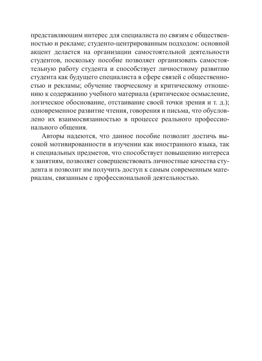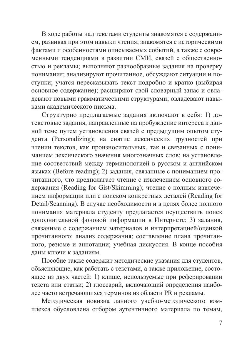 Учебное пособие содержит контрольные задания, которые направлены на совершенствование коммуникативной компетенции студентов, изучающих иностранный язык, в частности английский. Упражнения позволят студентам развить коммуникативные умения в четырех основных видах речевой деятельности — чтении, говорении, аудировании, письме, а также расширить словарный запас и знания грамматических конструкций, связанных со сферой рекламы и связей с общественностью, углубить навыки лингвистического и стилистического анализа профессиональных текстов. Материалом для контрольных заданий послужили аутентичные тексты, что дает возможность более глубокого вхождения в иноязычную среду. Для студентов и магистрантов, обучающихся по специальности «Реклама и связи с общественностью».