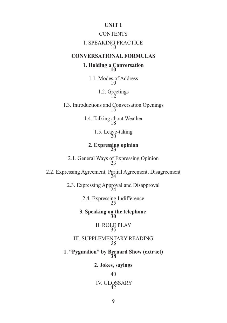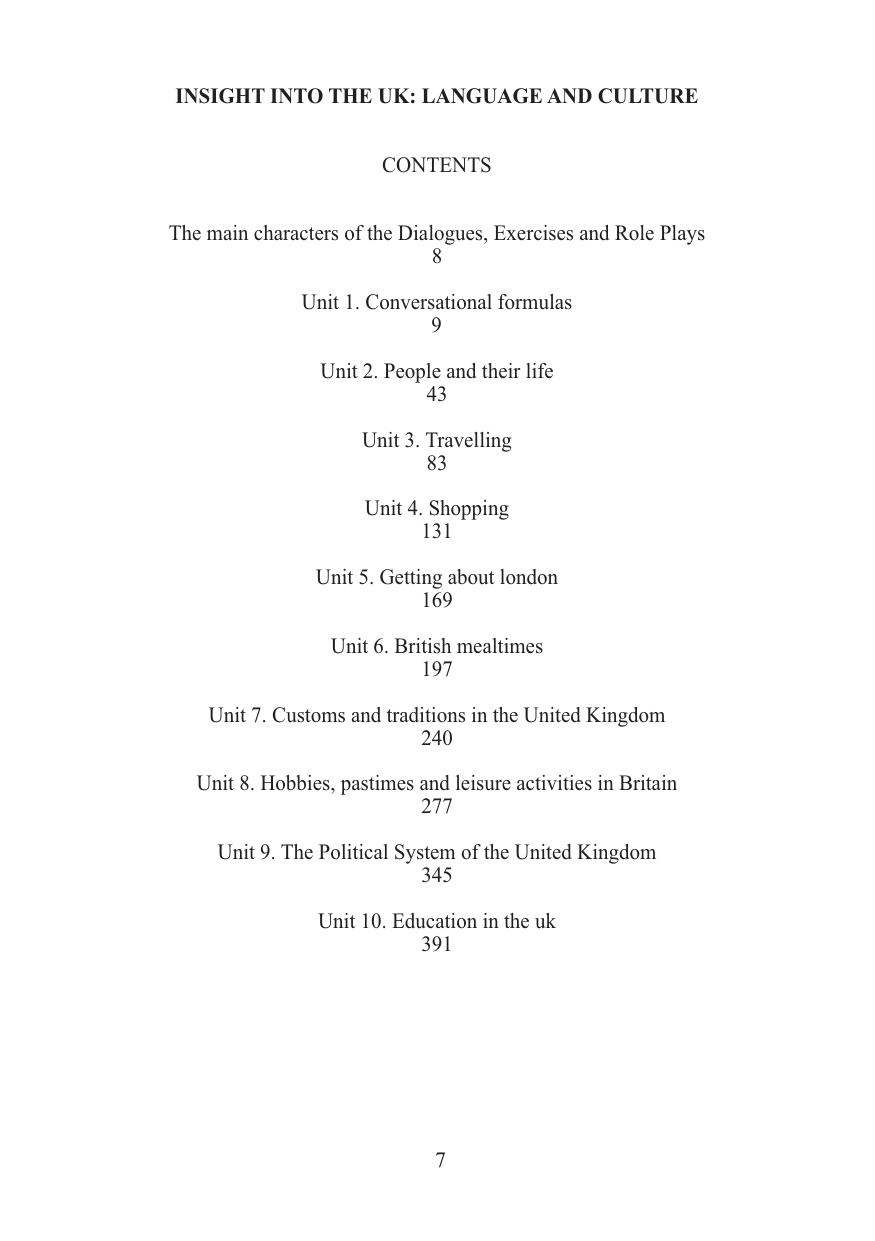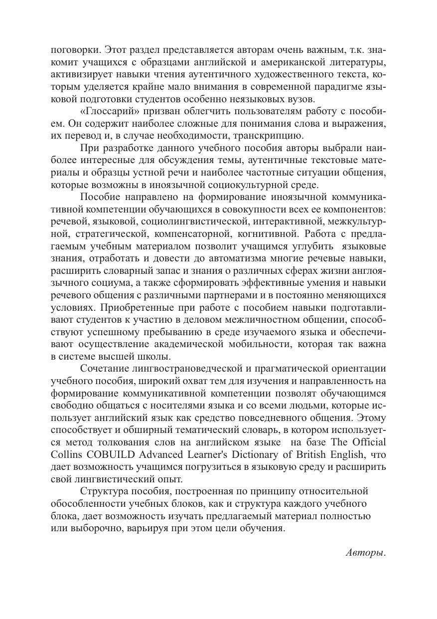 Лингвострановедческое учебное пособие для развития коммуникативной компетенции в устном вербальном общении состоит из 10 учебных тематических блоков (Unit), каждый из которых включает четыре раздела: I. Речевая практика; II. Ролевая игра; III. Приложение для чтения; IV. Глоссарий. Сочетание лингвострановедческой и прагматической ориентации пособия, широкий охват изучаемых тем, аутентичный материал, лексическая насыщенность учебных блоков, большое количество упражнений преимущественно речевого характера, а также нацеленность на формирование всех компонентов иноязычной коммуникативной компетенции позволят любым категориям обучающихся не только ознакомиться с современной действительностью страны изучаемого языка, но и свободно общаться на английском языке в различных ситуациях повседневного общения на уровне В1–В2 в зависимости от индивидуального исходного уровня, что, в частности, способствует развитию академической мобильности.