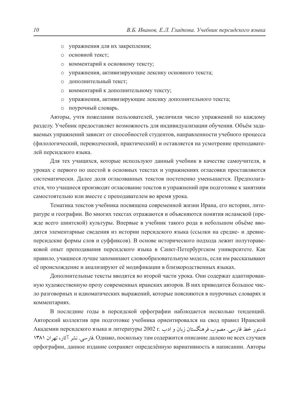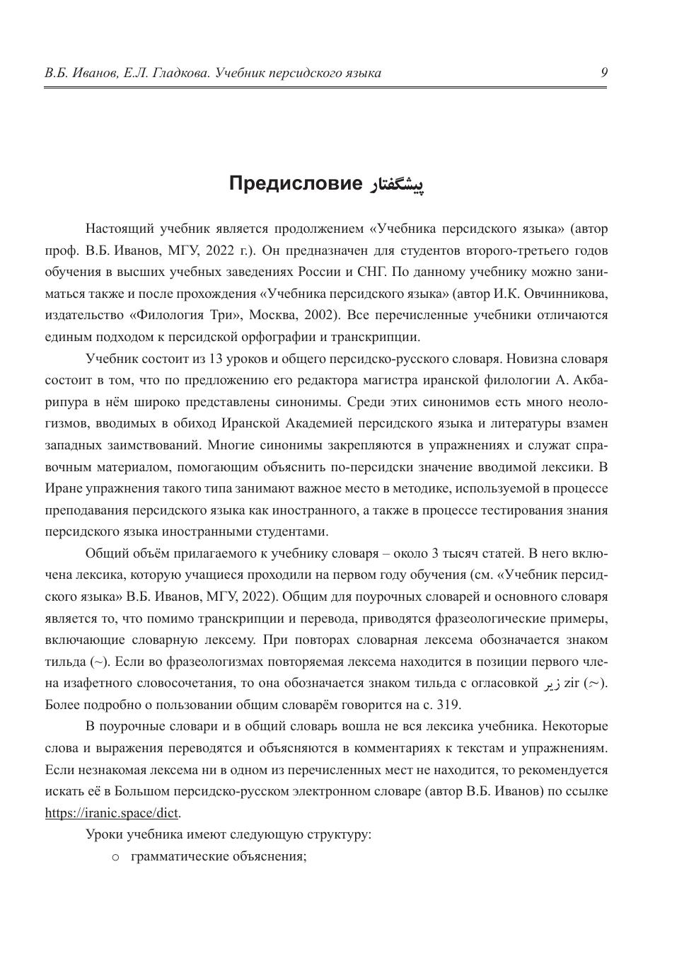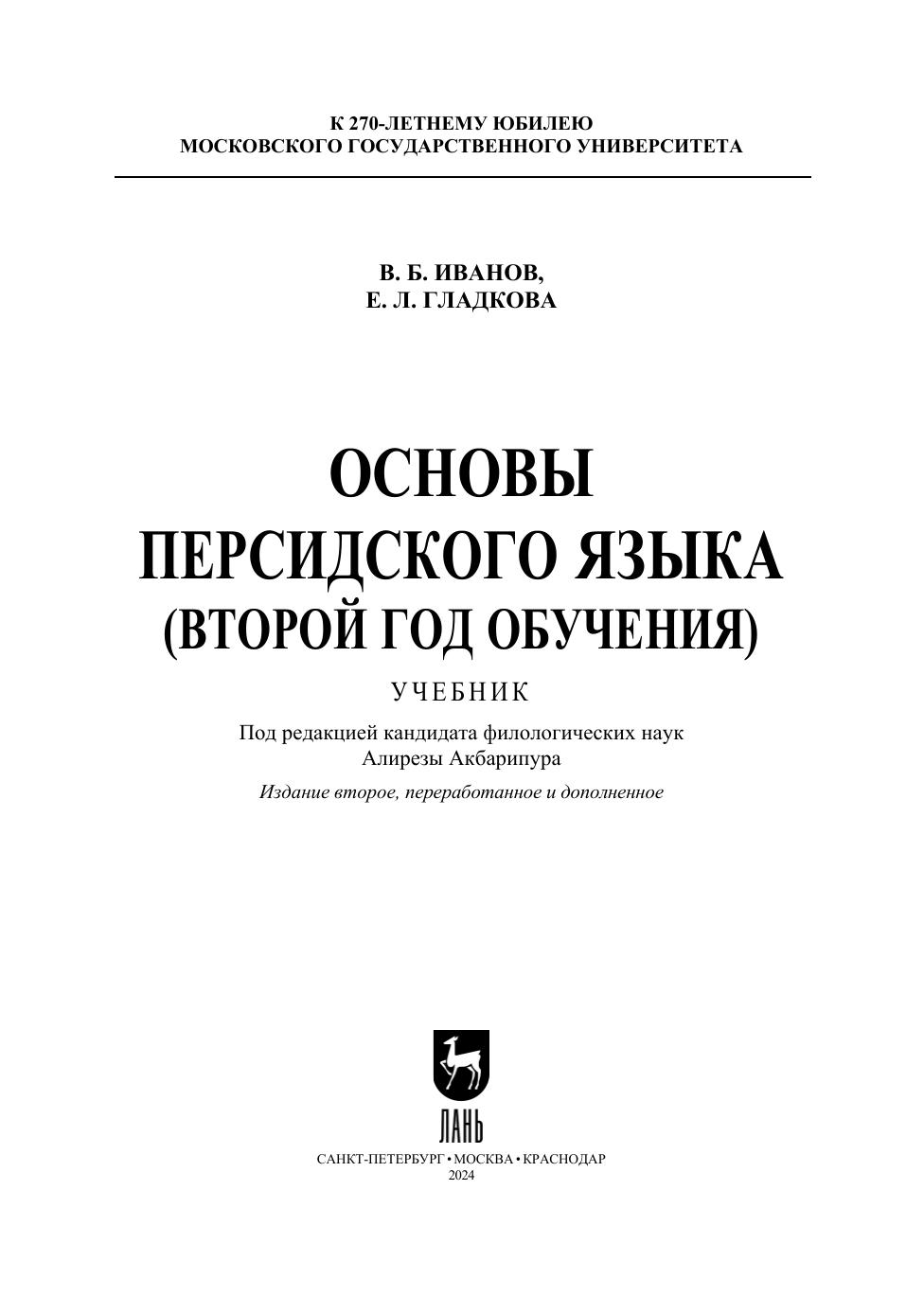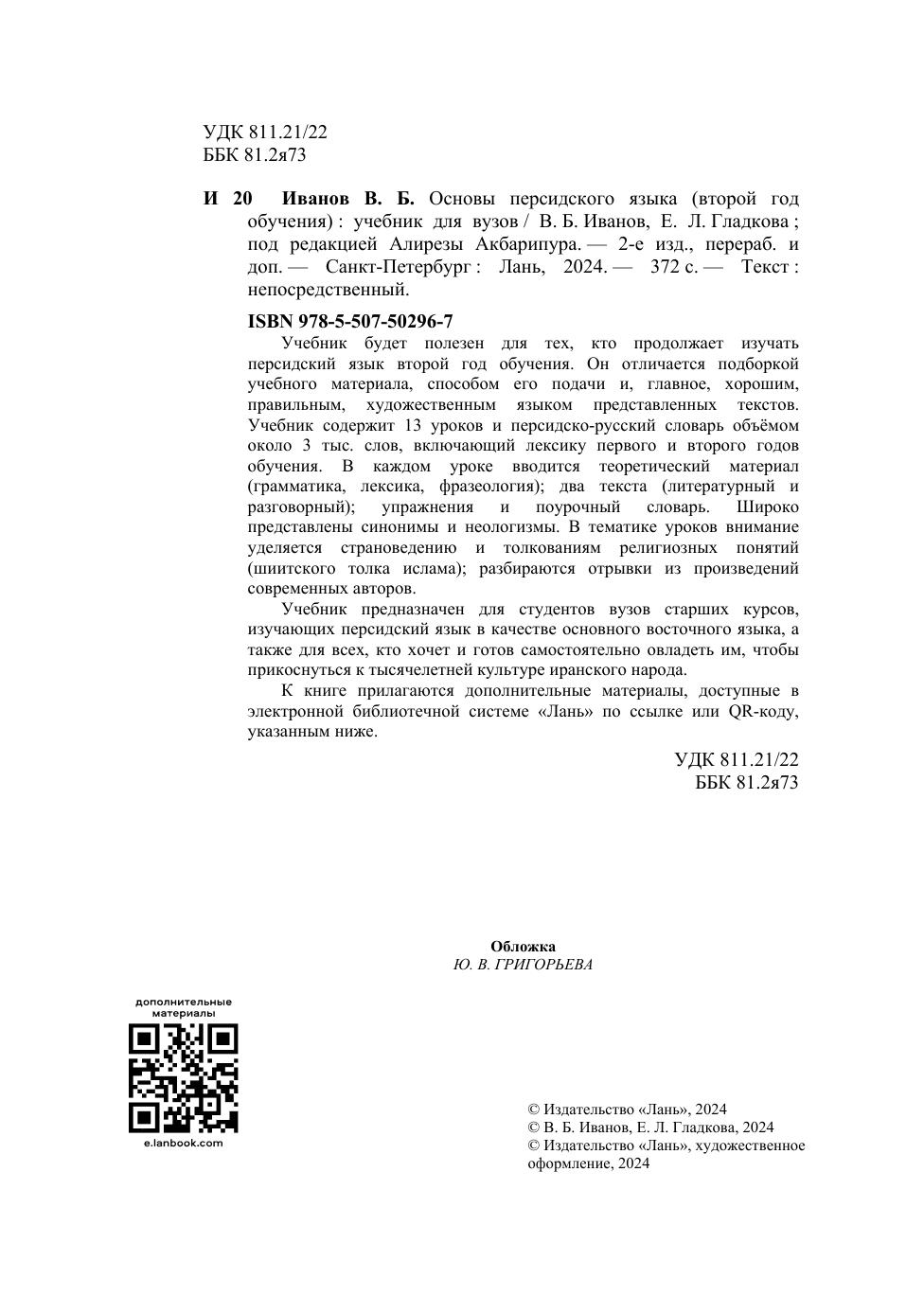 Учебник будет полезен для тех, кто продолжает изучать персидский язык второй год обучения. Он отличается подборкой учебного материала, способом его подачи и, главное, хорошим, правильным, художественным языком представленных текстов. Учебник содержит 13 уроков и персидско-русский словарь объёмом около 3 тыс. слов, включающий лексику первого и второго годов обучения. В каждом уроке вводится теоретический материал (грамматика, лексика, фразеология), два текста (литературный и разговорный), упражнения и поурочный словарь. Широко представлены синонимы и неологизмы. В тематике уроков внимание уделяется страноведению и толкованиям религиозных понятий (шиитского толка ислама), разбираются отрывки из произведений современных авторов. Учебник предназначен для студентов вузов старших курсов, изучающих персидский язык в качестве основного восточного языка, а также для всех, кто хочет и готов самостоятельно овладеть им, чтобы прикоснуться к тысячелетней культуре иранского народа. К книге прилагаются дополнительные материалы, доступные в электронной библиотечной системе «Лань» по ссылке или QR-коду, указанным ниже.