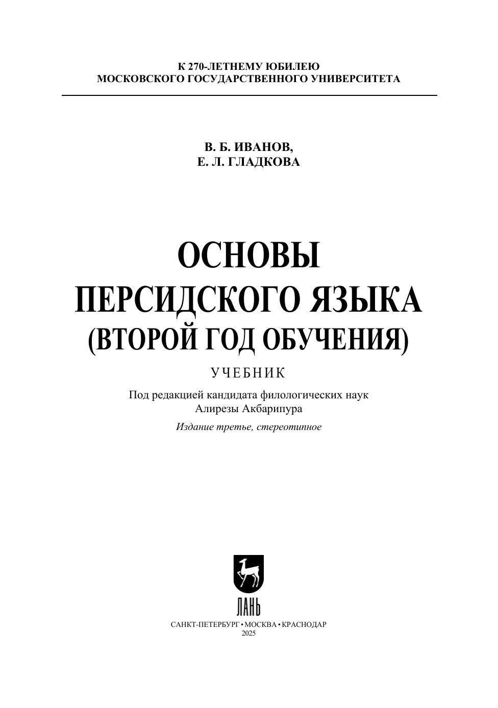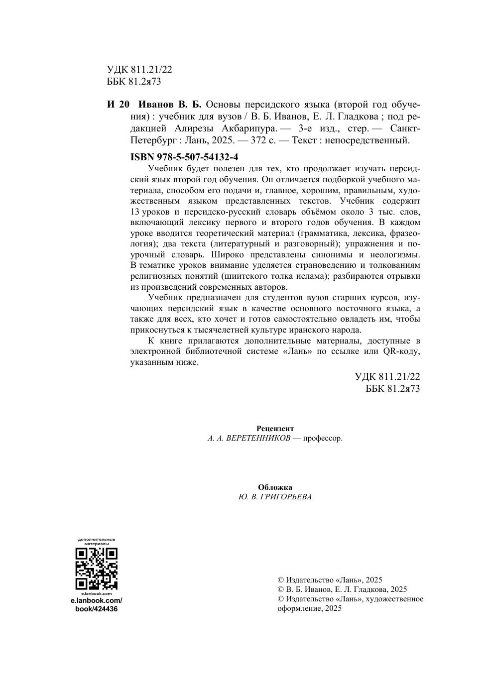 Учебник будет полезен для тех, кто продолжает изучать персидский язык второй год обучения. Он отличается подборкой учебного материала, способом его подачи и, главное, хорошим, правильным, художественным языком представленных текстов. Учебник содержит 13 уроков и персидско-русский словарь объёмом около 3 тыс. слов, включающий лексику первого и второго годов обучения. В каждом уроке вводится теоретический материал (грамматика, лексика, фразеология), два текста (литературный и разговорный), упражнения и поурочный словарь. Широко представлены синонимы и неологизмы. В тематике уроков внимание уделяется страноведению и толкованиям религиозных понятий (шиитского толка ислама), разбираются отрывки из произведений современных авторов. Учебник предназначен для студентов вузов старших курсов, изучающих персидский язык в качестве основного восточного языка, а также для всех, кто хочет и готов самостоятельно овладеть им, чтобы прикоснуться к тысячелетней культуре иранского народа. К книге прилагаются дополнительные материалы, доступные в электронной библиотечной системе «Лань» по ссылке или QR-коду, указанным ниже.